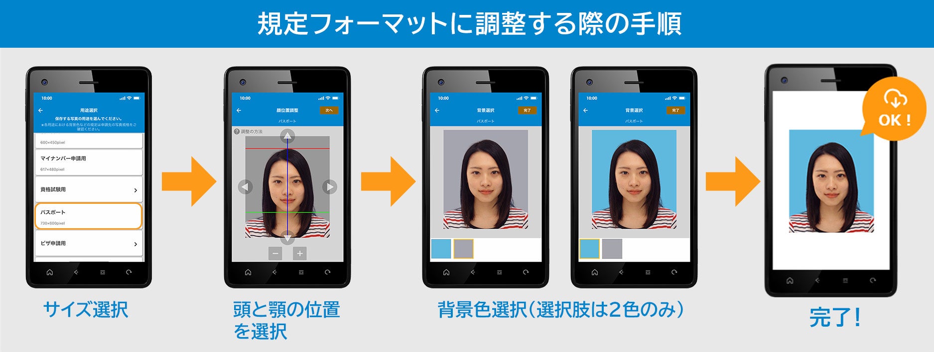 パスポートのオンライン申請向け顔写真フォーマット機能を証明写真機アプリに搭載