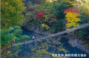 かつて村人の生活道だった吊橋。周辺は奥大井県立自然公園で南アルプスユネスコエコパークに指定されている。