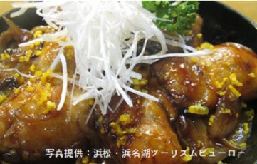 冬の浜名湖を代表する特産の牡蠣に、名物のうなぎのタレに付け込み蒲焼きにしたもの。浜名湖産の海苔、遠州産の玉ねぎ、みかんの皮を基本トッピング。プリップリッの牡蠣とうなぎのタレとの相性が抜群の逸品。