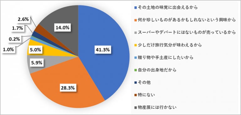 物産展の利用目的においては、「その土地の味覚に出会えるから」が41.3%と一番多い結果になりました。次いで、「何か珍しいものがあるかもしれないという興味から」が28.3%になりました。普段、スーパーマーケットなどで販売していないようなその土地ならではの商品や珍しい商品に出会えることがメリットなのかもしれませんね。