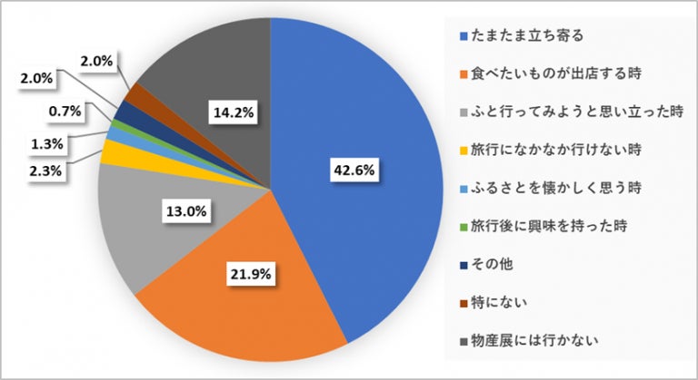 どのような時に物産展へ行きますかという質問に対しては、「たまたま立ち寄る」と回答した方が42.6%で最も多くなりました。次いで、「食べたいものが出店する時」と回答した方が21.9%、「ふと行ってみようと思い立った時」と回答した方が13.0%でした。「たまたま立ち寄る」と「ふと行ってみようと思い立った時」合わせて、半数以上が目的のない状況で物産展へ行くことがわかりました。