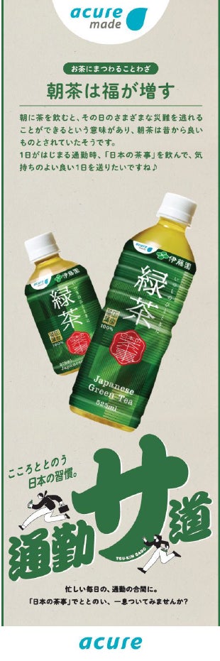 アキュアの自販機で、1日を通して緑茶の売れる時間帯が「朝」ということからも、通勤と緑茶の親和性が高いことが分かります。「日本の茶事」が、通勤時間を、こころを“ととのえる”時間へと変えていきます。