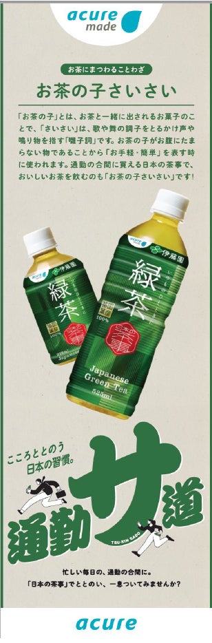 アキュアの自販機の側面で2月から実施する広告では、通勤にちなんだ、お茶に関することわざを読み物として展開します。お茶に関連したことわざは非常に多く存在していますが、それだけ「お茶文化」は日本人の生活習慣を通じて育まれ、根付いてきました。通勤時に「日本の茶事」を飲みながら是非、ご覧ください。