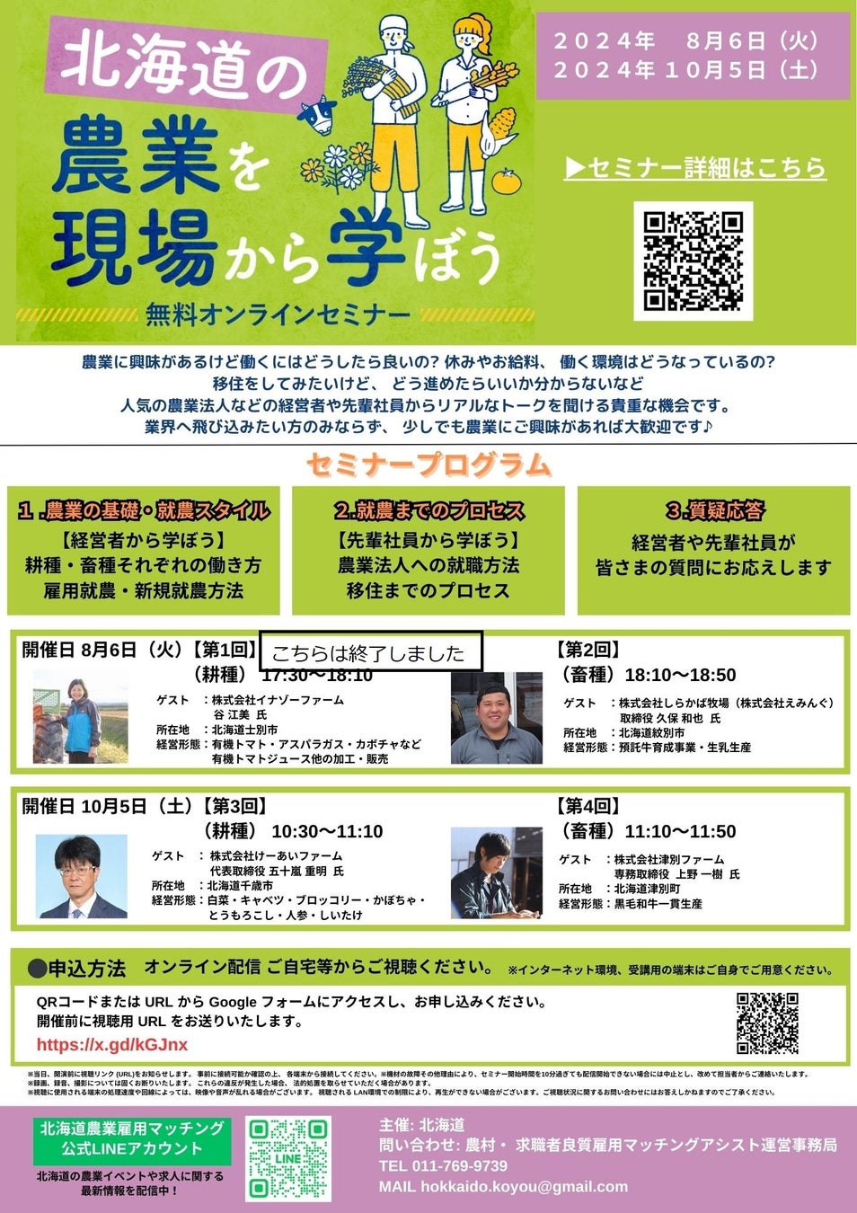 農業で働くことに興味がある方向けに、10月5日(土)に無料オンラインセミナーを開催します。今回は、道内農業法人の役員お二人をお招きして、各種農業基礎知識や就農後のキャリアパスなどのお話をします。
