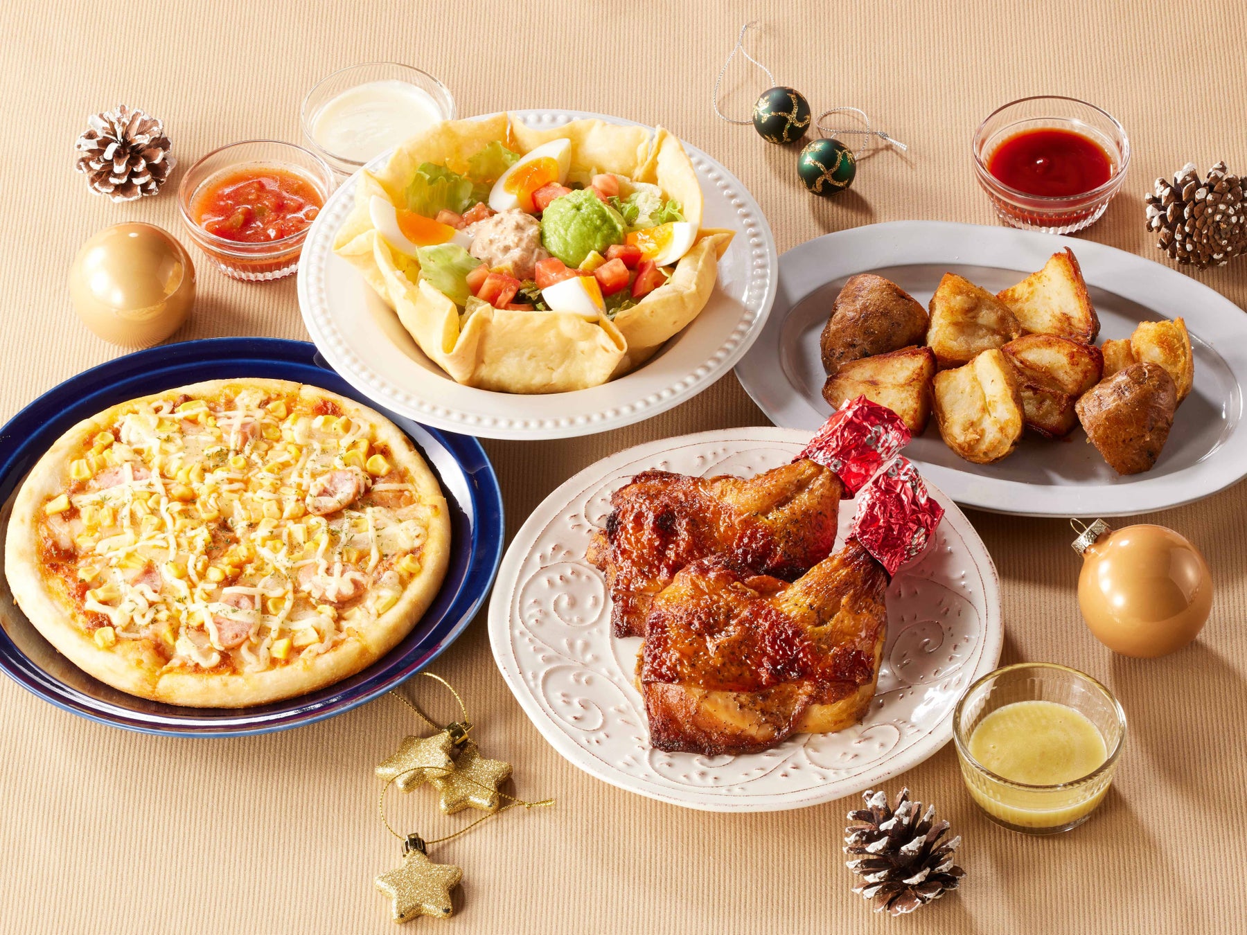 また、季節限定のピッツァやクリスマスには定番のローストチキン、シェアにぴったりなポテトは単品でもご注文可能です。シーンに合わせ、お好みの商品を組み合わせてお選びください。