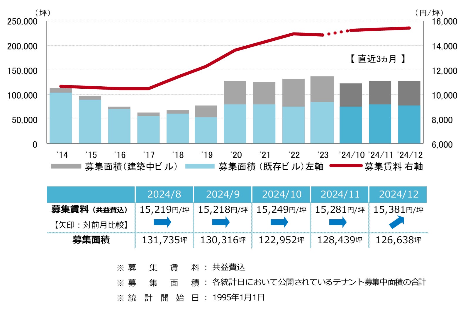 募集賃料は前月比プラス100円/坪の15,381円/坪となった。小幅な上昇が3ヵ月連続となり、2000年以降の最高値更新が続いている。