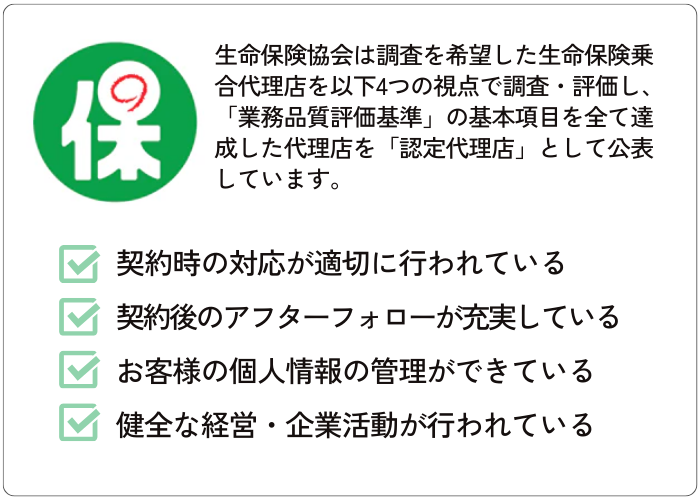 生命保険協会が主体となり、消費者にとって理想的な生命保険乗合代理店(複数の生命保険会社と募集業務委託契約を締結している代理店)として求められる取組みを「業務品質評価基準」として定め、この基準に基づいて代理店の品質を調査する取組みです。生命保険協会は調査を希望した生命保険乗合代理店を以下4つの視点で調査・評価し、「業務品質評価基準」の基本項目を全て達成した代理店を「認定代理店」として公表しています。