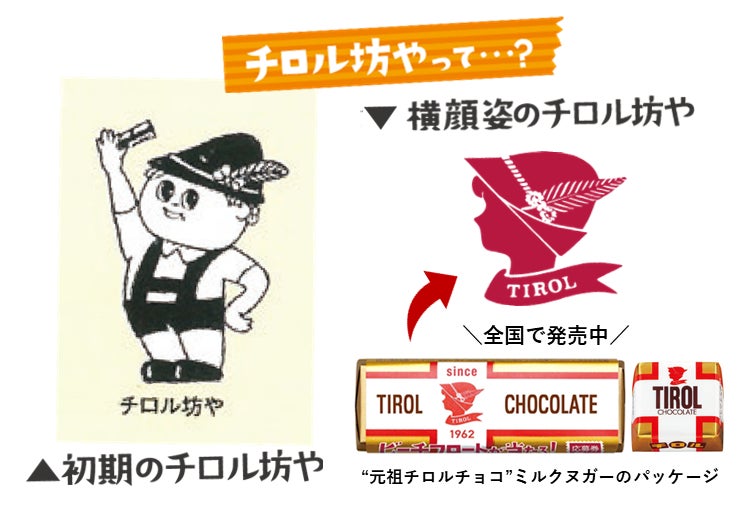 チロルチョコで最も古いキャラクター。元祖チロルチョコのミルクヌガーのパッケージにもある、スタイリッシュな横顔姿が長く親しまれていますが、初期はふっくら愛らしい姿でした。