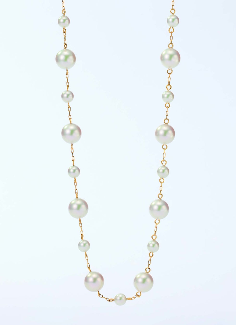 日本製貝パールをリズミカルに並べたステーションネックレスが登場します。