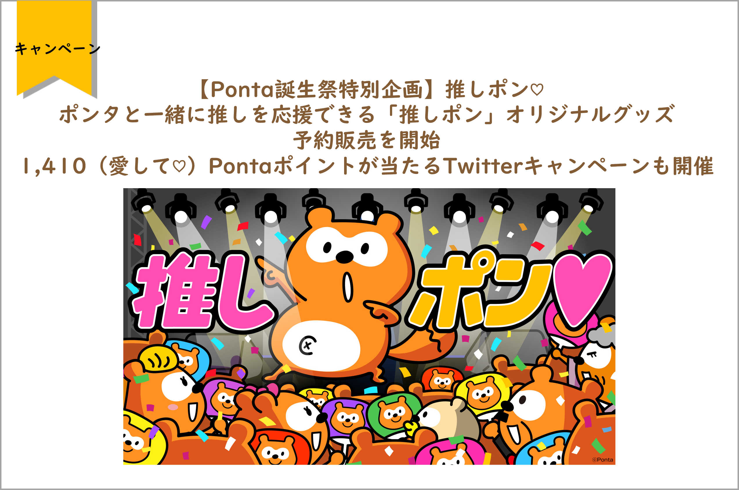 【Ponta誕生祭特別企画】推しポン♡ ポンタと一緒に推しを応援できる「推しポン」オリジナルグッズ予約販売を開始 1,410(愛して♡)Pontaポイントが当たるTwitterキャンペーンも開催