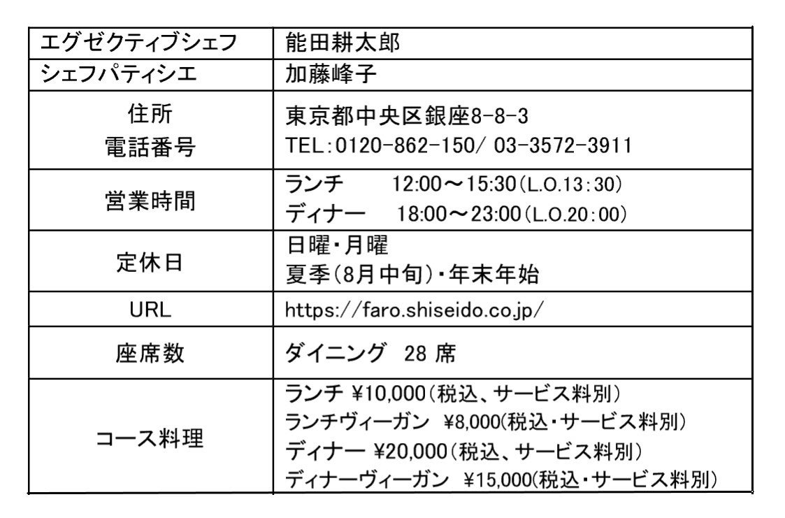 経営は「美しい生活文化の創造」を企業理念とし、ビューティーイノベーションを目指す資生堂。運営を資生堂パーラーが担います。東京銀座資生堂ビル10階のファロでは、現代イタリア料理が備える伝統と先進性に、日本の豊かな食材や文化を重ね合わせたイタリアンの枠にとらわれないモダンでオリジナリティーあふれるクリエーション(料理)をご提供しています。ファロが特に力を入れているのはヴィーガンコース。ヴィーガンの方だけではなく、“美味しく食べて、体の中から美しく”を求める多くの方々に是非ご体感いただきたいコースメニューです。同時に、ヴィーガンというライフスタイルにサスティナビリティや平和の可能性を感じており、環境や動物に負担をかけない食生活を通して、“心豊かに楽しく暮らしながら、地球や社会の美しさも守る”取り組みも追求しています。