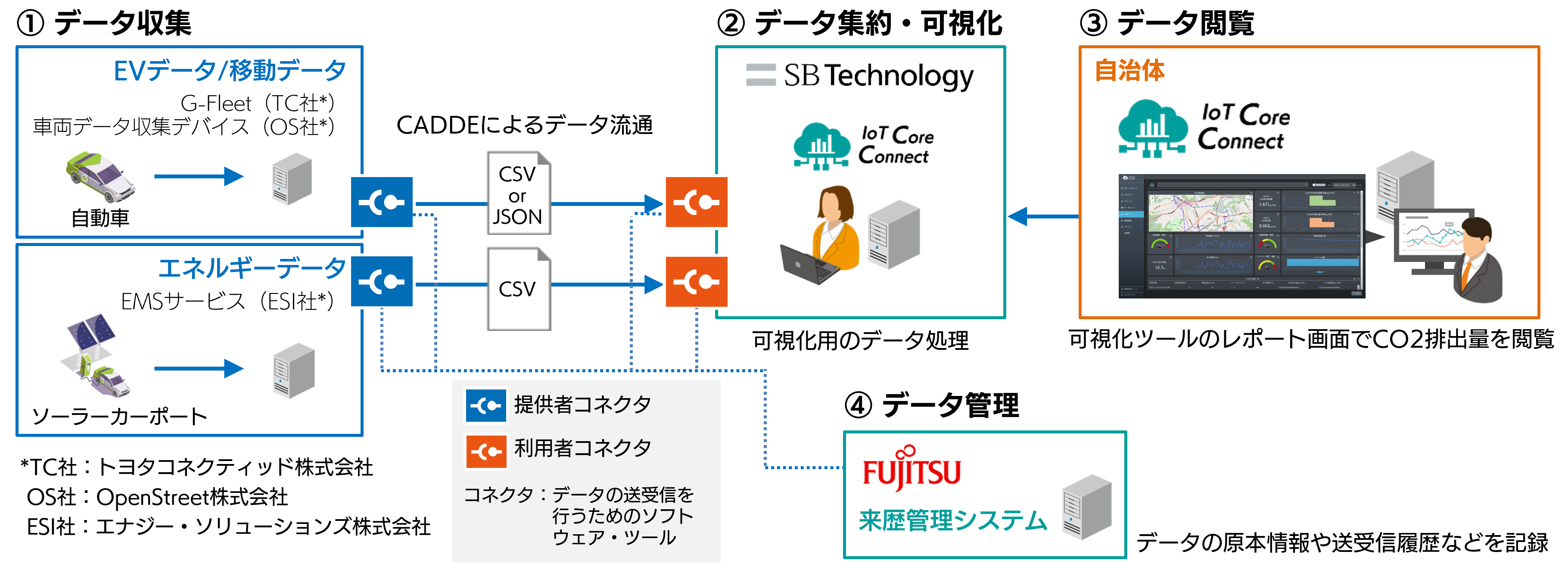 今回、SBTと富士通は、4自治体とともに、データの流通履歴を記録、管理する来歴管理システムと「CADDE」を連携させ、データの信頼性を確保した上で、多様なデータの収集から可視化までを行う実証実験を実施しました。