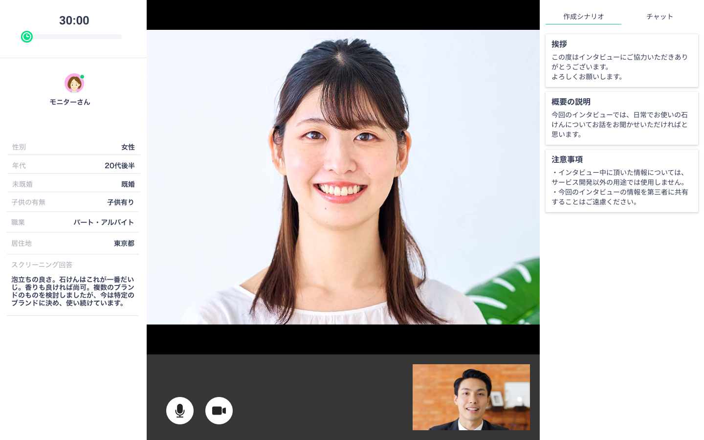 新機能のビデオインタビューでは、モニターの表情や仕草、反応などから、定性調査には欠かせないリアルな情報収集が行えます。専用のビデオインタビュー画面から、モニターの性別や年齢、居住地などの属性や、「ライブスクリーニング」の回答結果を確認しながらインタビューが行えます。さらに事前作成したインタビューシナリオを画面に表示できるため、それに沿ってスムーズに対話を進めることができ、モニターの本音を引き出します。