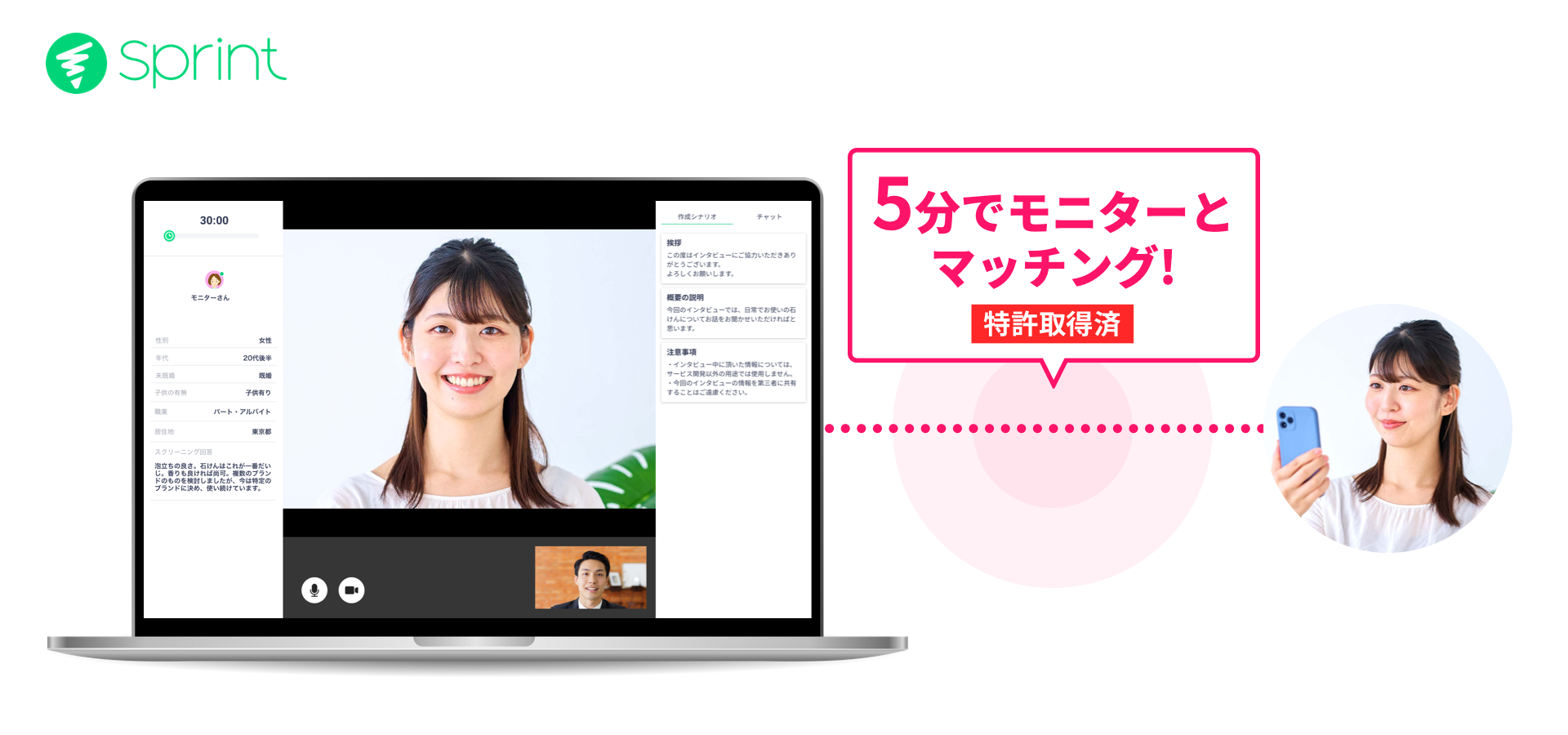「Sprint」(スプリント)は、チャットを使ったオンラインインタビューサービスです。その場でモニターを選定する「ライブスクリーニング」により、モニター募集から5分でインタビューを開始できます(特許取得済)。消費者の興味や嗜好の移り変わりが激しい現在、より質の高い定性調査を行い、購買行動につながるインサイトを見つけることが必要です。そこで今回、対面によるビデオインタビュー機能を新搭載し、モニターの表情や反応など、より多くの定性情報が入手可能となりました。すべてオンラインで完結するため、会場費や交通費、モニター収集やスケジュール調整、移動など、これまで時間やコストのかかっていた定性調査を低価格・短納期・高品質に行えます。