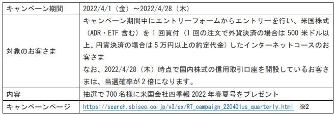 また、上記キャンペーンと同時に、米国株式を一定金額以上買付したお客さまを対象に、「【国内信用口座開設済みで確率2倍!】700名様に当たる!米国会社四季報プレゼントキャンペーン」を実施します。2022年4月28日時点で国内株式の信用取引口座を開設しているお客さまについては、当選確率が2倍になります。