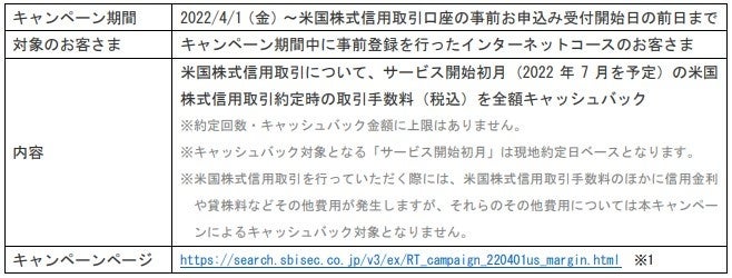 株式会社SBI証券(本社:東京都港区、代表取締役社長:髙村正人、以下「当社」)は、2022年4月1日(金)から米国株式信用取引について事前登録の受付を開始するとともに、サービス開始初月(2022年7月予定)の米国株式信用取引約定時の取引手数料を実質無料とする「【事前登録で手数料1ヵ月無料!】米株信用カウントダウンキャンペーン」を開催することとなりましたので、お知らせします。