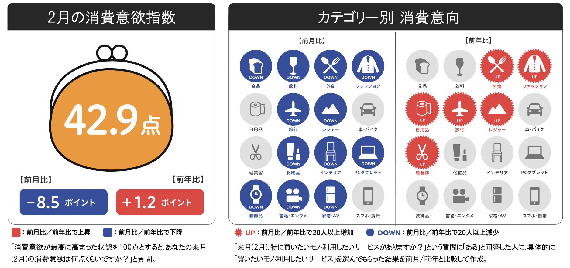 2月の消費意欲指数は42.9点。前月比は-8.5ptと大きく低下するも、前年比は+1.2ptとやや上昇しました。