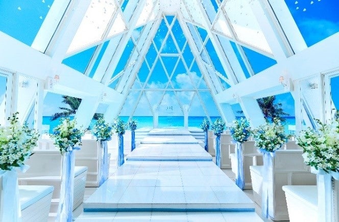 「グアム挙式プラン」では、青くきらめくグアムの海と空、白砂のビーチを独占できる、全方向ガラス張りの人気チャペル「ブルーアステール」で挙式いただき、挙式後には、淡いブルーを基調にしたシンプル&ナチュラルなオーシャンフロントのバンケットで、贅沢なプライベートリゾートパーティが叶います。さらに当プランには、ユナイテッド航空のグアム⇔福岡間のカップル1組2名様分の往復航空券に加え、デラックスホテル宿泊3泊分、空港からホテル間の専用車での送迎サービスも含まれており、リゾートウェディングの特徴である旅と挙式を存分にお楽しみいただけるプランとなっています。