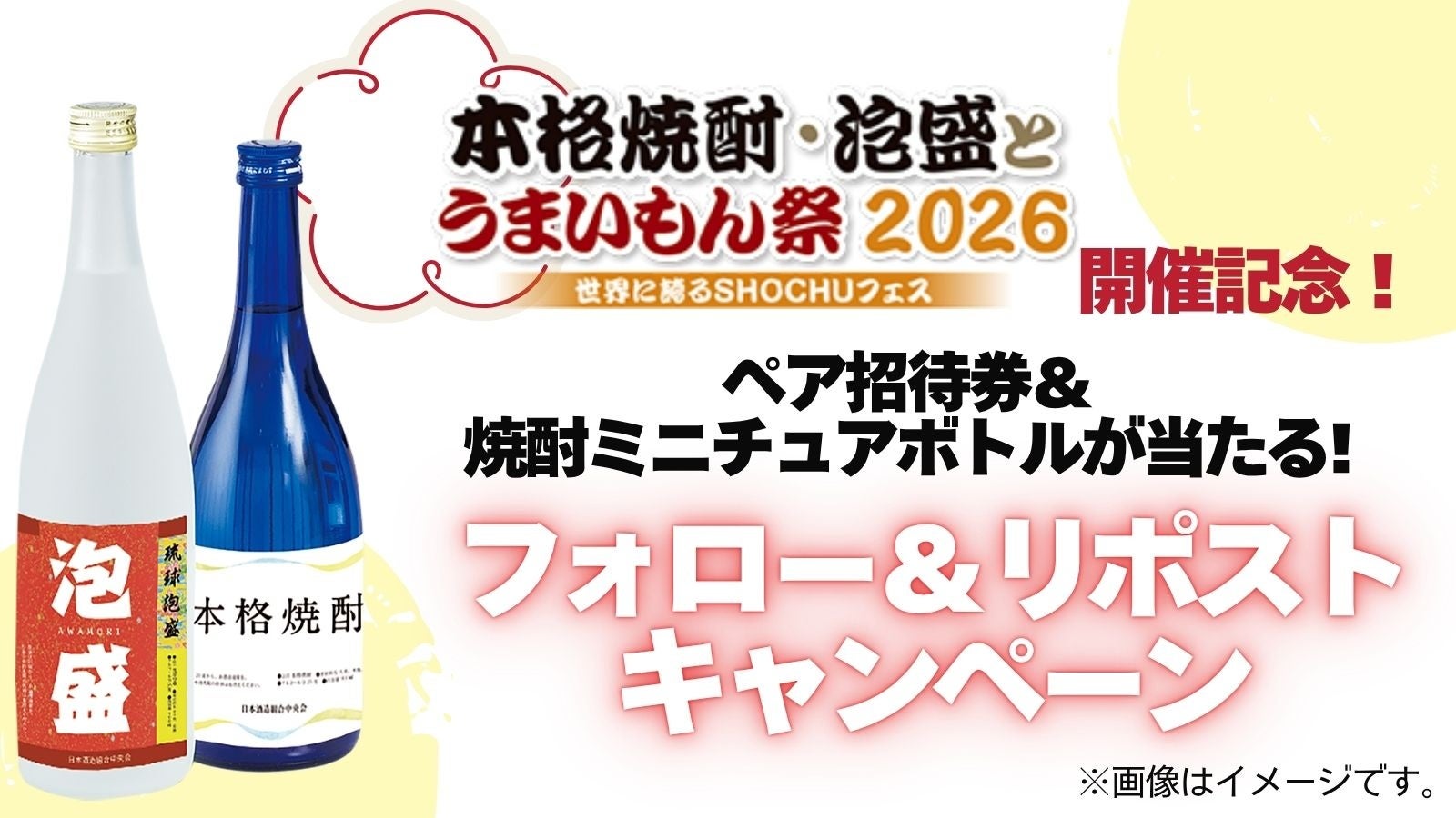 「本格焼酎・泡盛とうまいもん祭2026~世界に誇るSHOCHUフェス~」の開催を記念してSNSキャンペーンを実施!イベント公式アカウントをフォローいただき、指定の投稿をリポストいただくと40名さまにペア招待券と焼酎ミニチュアボトル(100ml※銘柄は選べません)をプレゼント!この機会にぜひご参加ください!
