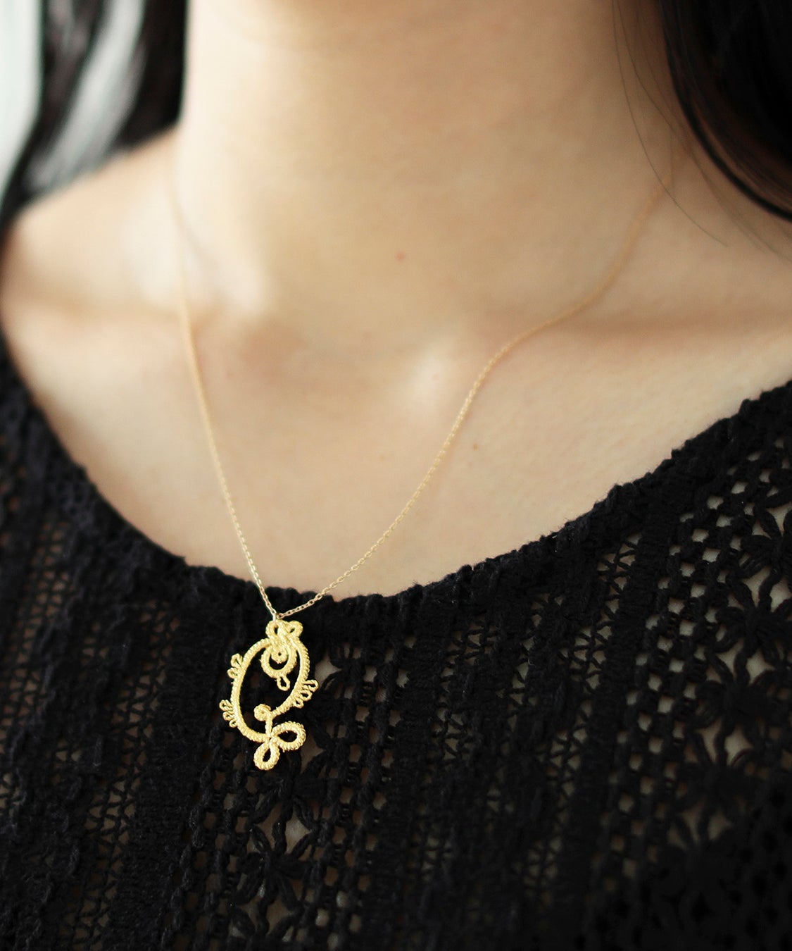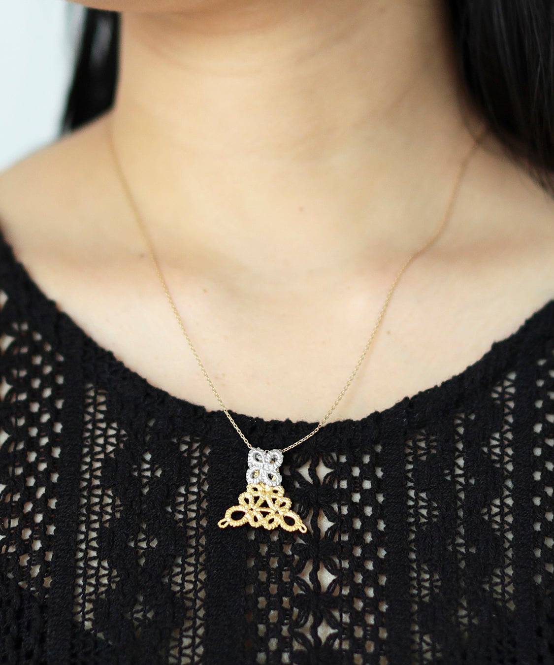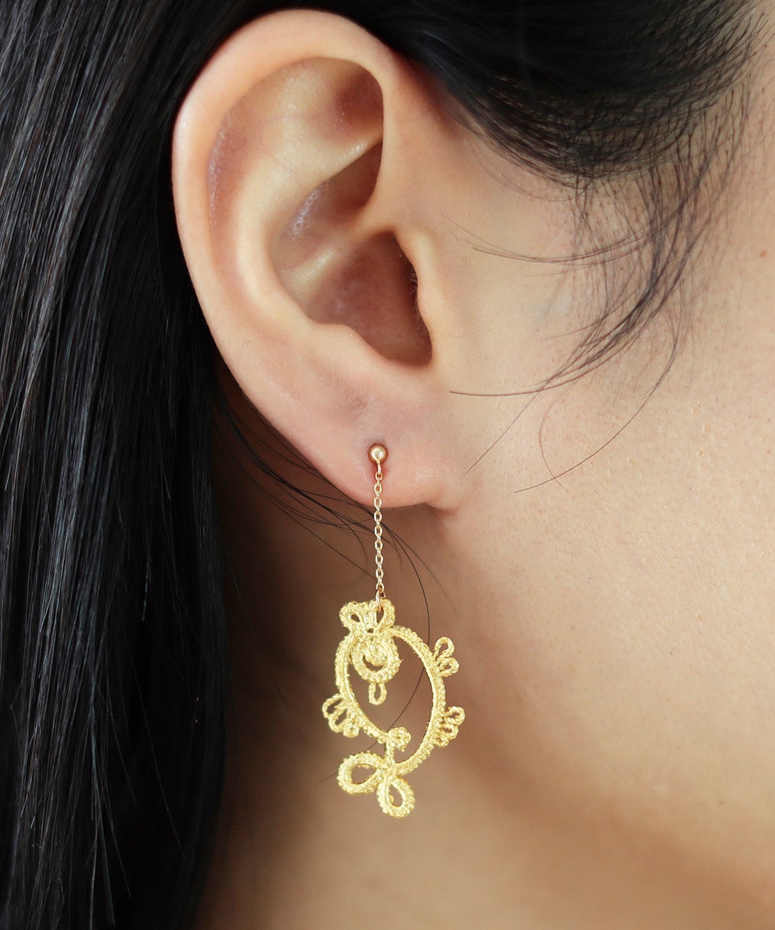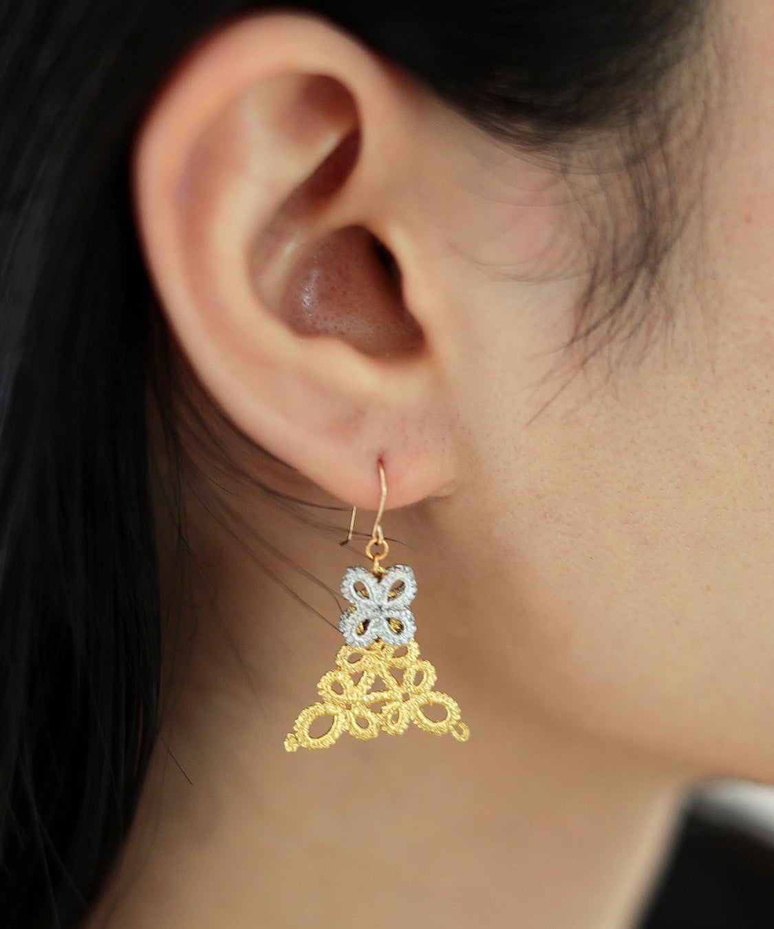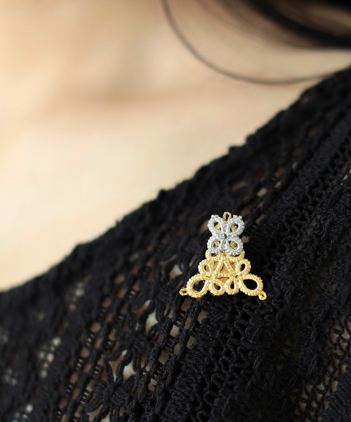 一点一点手作業で編まれたレースに、贅沢に金箔を何枚も重ねることによって生まれる気品ある輝きと、ジュエリー制作への意欲を感じるユーモアさが融合した魅力的なジュエリーを制作する〈ゴールド・ノット〉。素材は糸と金箔を使用し、金属アレルギーの方にも身に付けていただきやすい一品です。
