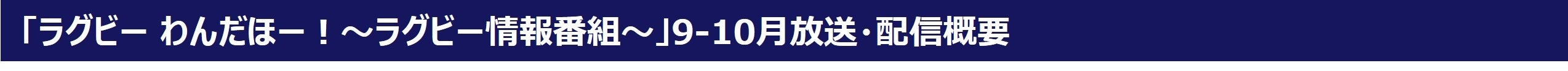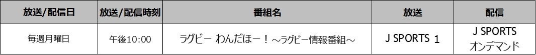 また、「ラグビー わんだほー! ~ラグビー情報番組~」は、大会期間中、毎週月曜に放送・配信いたします。9月8日(金)の開幕直前に特別編成する「ワールドカップ開幕直前SP」では、日本代表の最新情報、優勝候補同士が対戦する開幕戦(フランス vs. ニュージーランド)の注目ポイント、コメンテーター村上晃一氏による現地レポートなど情報満載でお届けします。