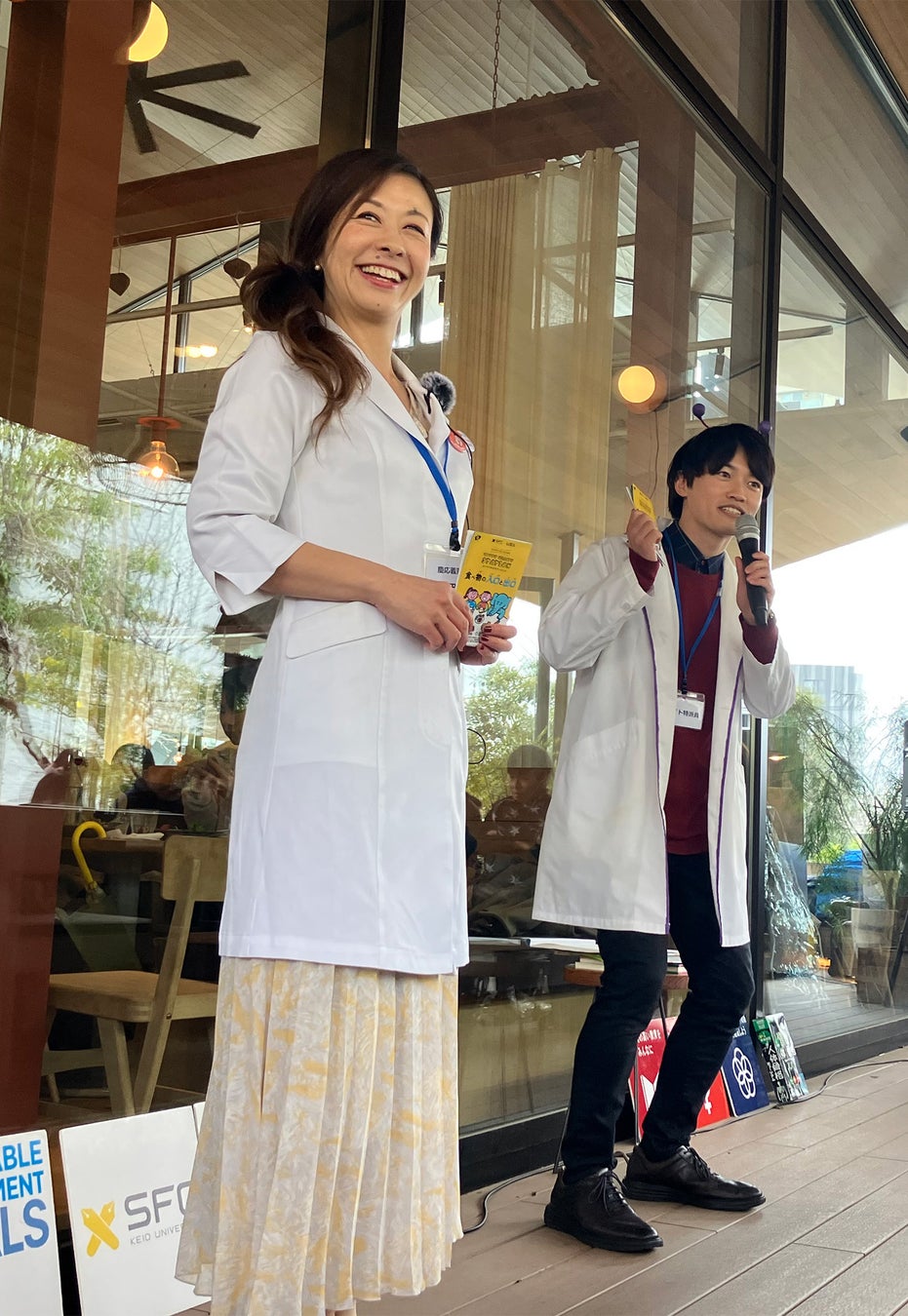 当日は、慶應義塾大学 環境情報学部 中澤研究室 本田先生とサイエンスコミュニケーターの佐伯恵太さん扮する、エイト特派員より、絵本を使った読み聞かせを実施し、プライベートゾーンのケアの大切さを伝えました。また、疑似経血・疑似便を用いて、トイレットペーパーで拭くだけでなく水で濡らしてから拭いた方がきれいに落ちることがわかる実験や、ペットボトルでシャワートイレのおしり用をイメージした大きい穴が一つのものと、ビデ用をイメージした小さい穴が複数あるものから水の出方の違いがわかる実験を通して、ビデの良さを体験いただきました。