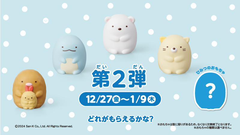ハッピーセット「すみっコぐらし」からは、クリスマスやお正月に家族や友達みんなで楽しめる、まん丸としたかわいいフォルムのすみっコたちのおもちゃ8種類とひみつのおもちゃ2種類の全10種類が登場します。