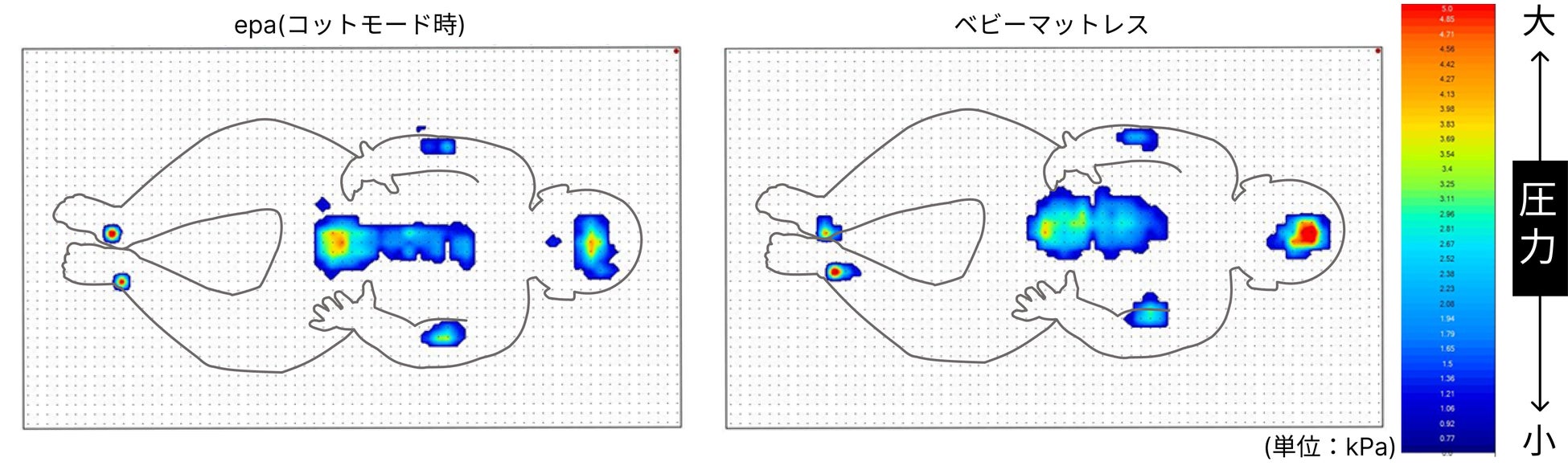 (※3) 180°フルフラットにした状態のepa(画像左)とベビーマットレス(画像右)に、赤ちゃん人形6kgを乗せたときの