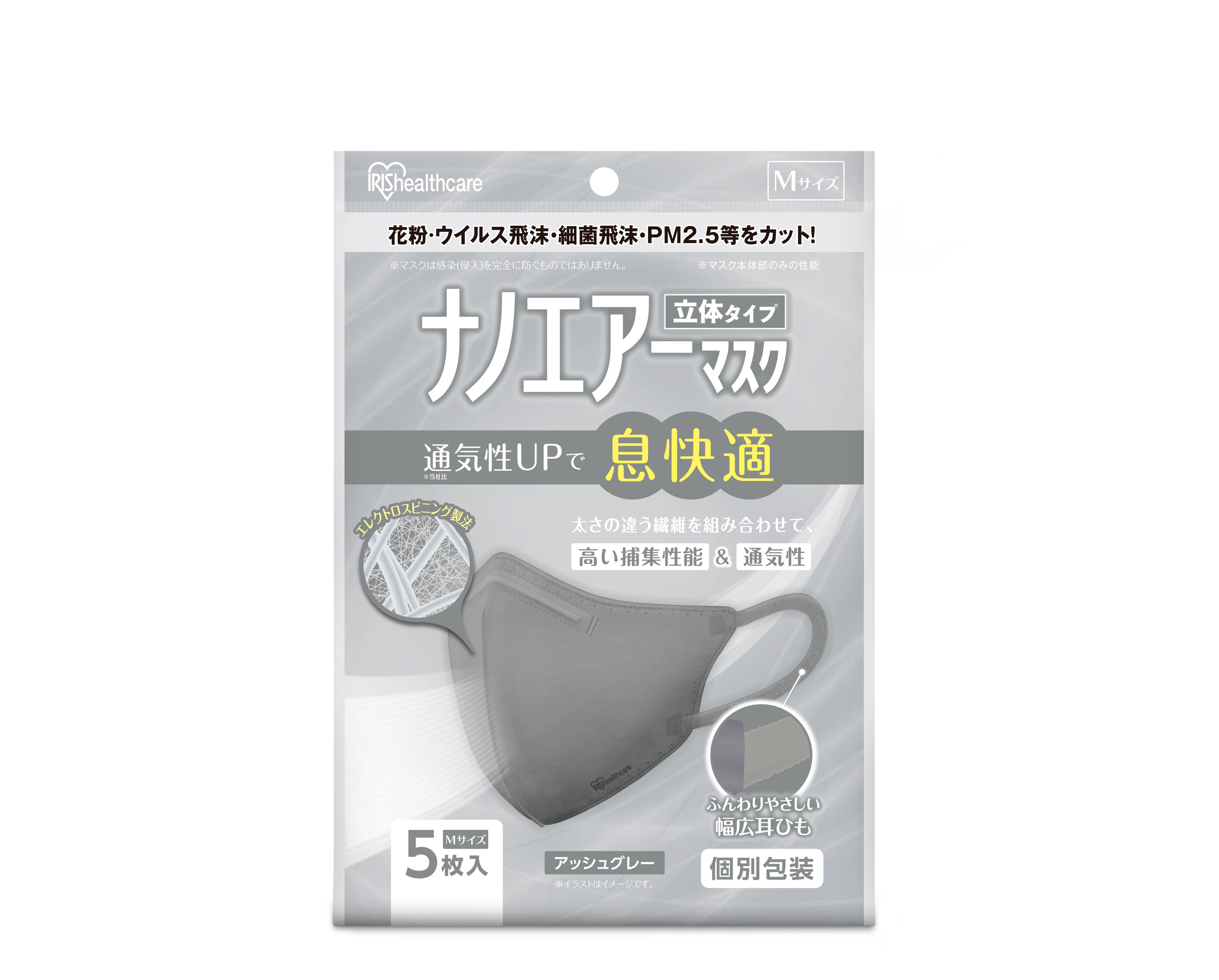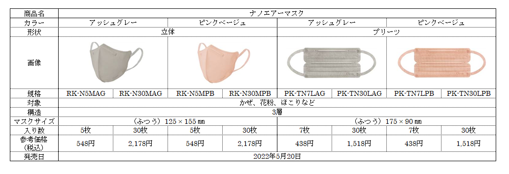 今回発売する「ナノエアーマスク」には従来のプリーツタイプに加え、新たに立体タイプを追加しました。また同シリーズ初のカラーマスクとして、定番色の「アッシュグレー」と血色カラーの「ピンクベージュ」の2色を展開し、機能性とファッション性も追求しています。