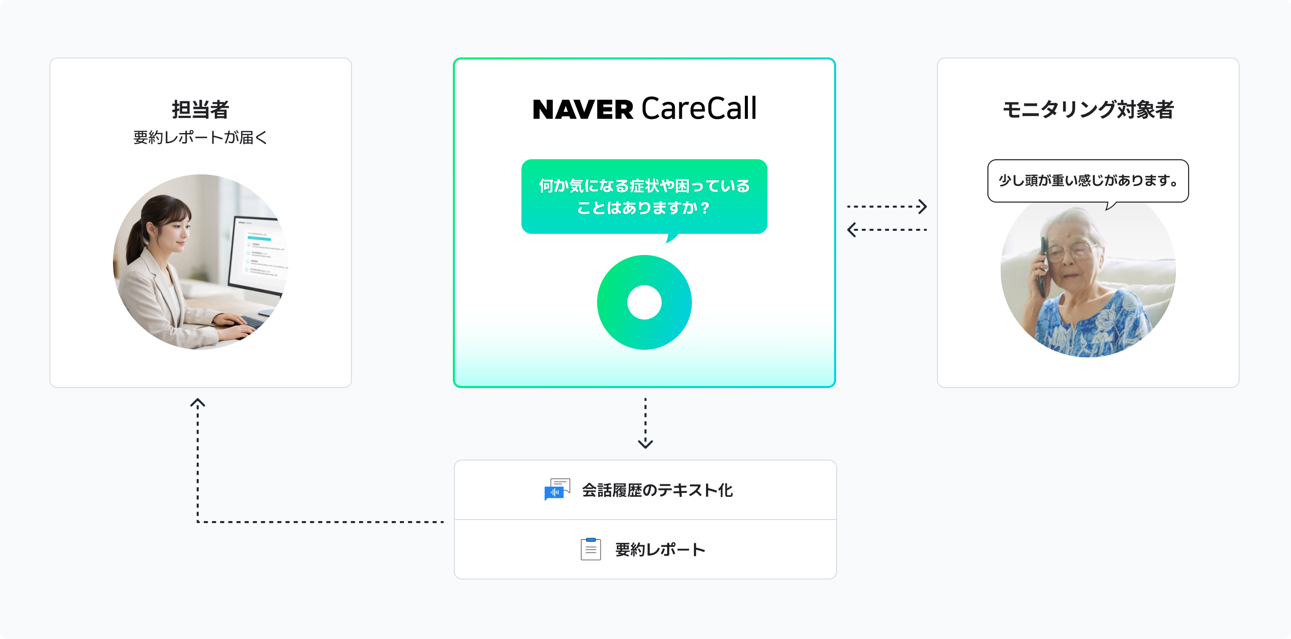 AIが対象者へ自動で電話をかけ、会話を通じて健康状態などを確認します。会話内容は文字起こしされ、内に自動で記録・分析。健康上の異常や兆候が見られる際は、担当者へ通知します。