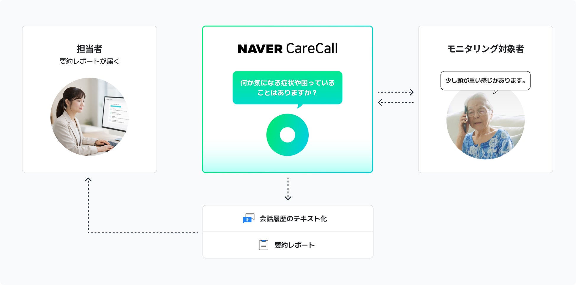 本サービスは、主に福祉事業者向けに提供され、ケアマネージャーが担う利用者への電話連絡や、健康状態の記録に要する業務負担を軽減し、人による対応を必要とする高齢者のフォローに集中することを可能にします。