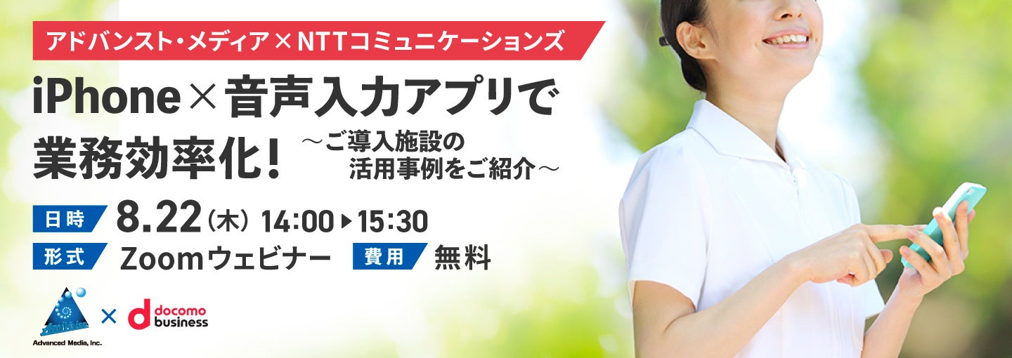 【オンラインセミナー】アドバンスト・メディア×NTTコミュニケーションズ「iPhone×音声入力アプリで業務効率化!~ご導入施設の活用事例をご紹介~」【8月22日(木)開催】