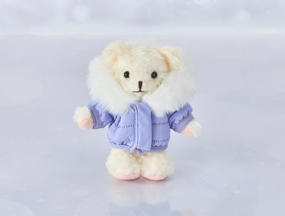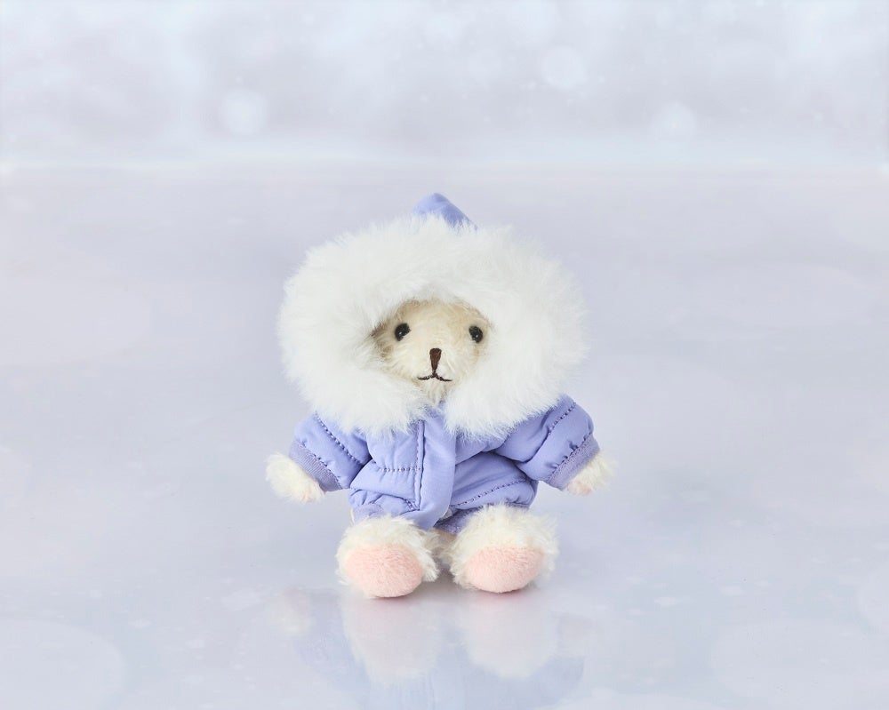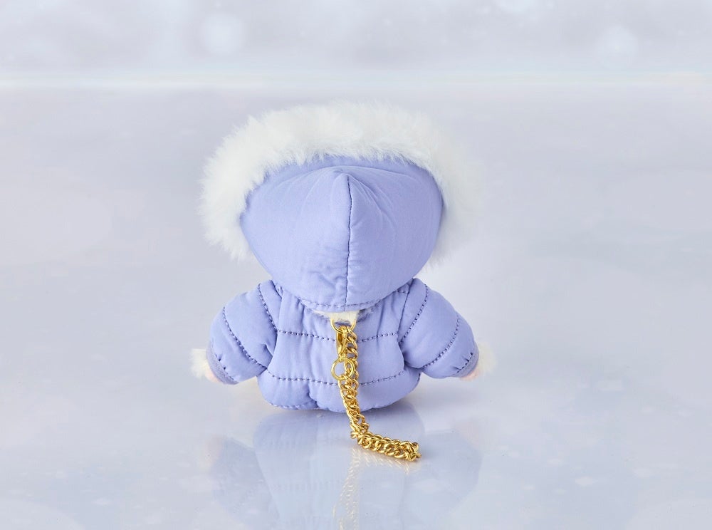 ラベンダーカラーのダウンジャケットを着たベアフル®。カプチーノカラーのボディが冬らしく、チェーン付きで、おでかけのお供にぴったりです。