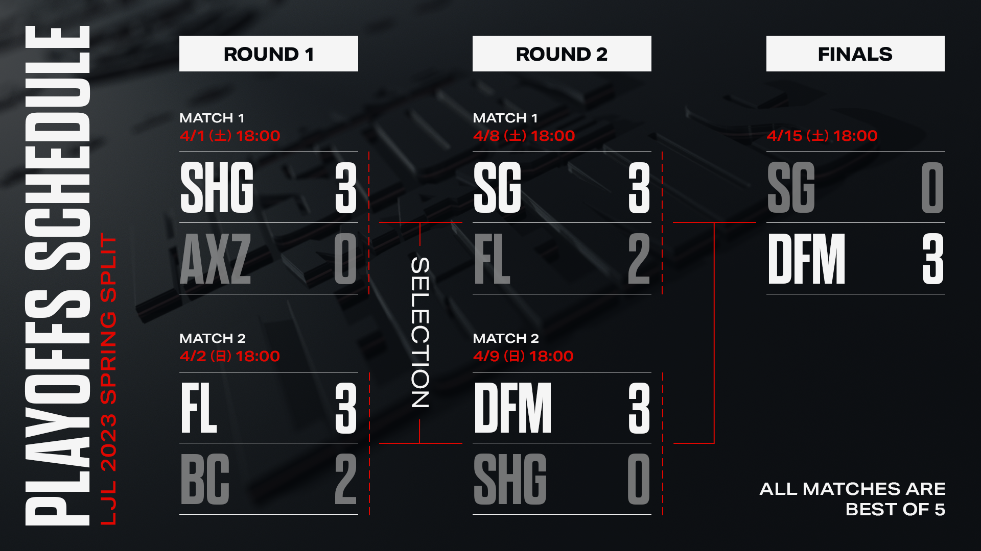 LJL 2023 Spring Split Playoffs の全てのマッチの対戦結果は以下となります。