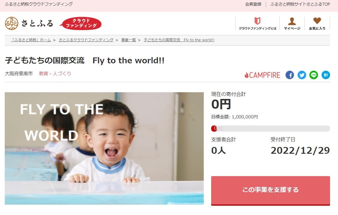 大阪府泉南市とふるさと納税ポータルサイト「さとふる」(https://www.satofull.jp/)を運営する株式会社さとふる(本社:東京都中央区、代表取締役社長:藤井 宏明)は、寄付金の使途に応じて事業を立ち上げ寄付を募る「さとふるクラウドファンディング」(https://www.satofull.jp/projects/top.php)にて、泉南市で育つ子どもたちに、国際交流を通して異文化を身近に体験できる環境を提供するため、2022年10月7日より寄付受け付けを開始します。