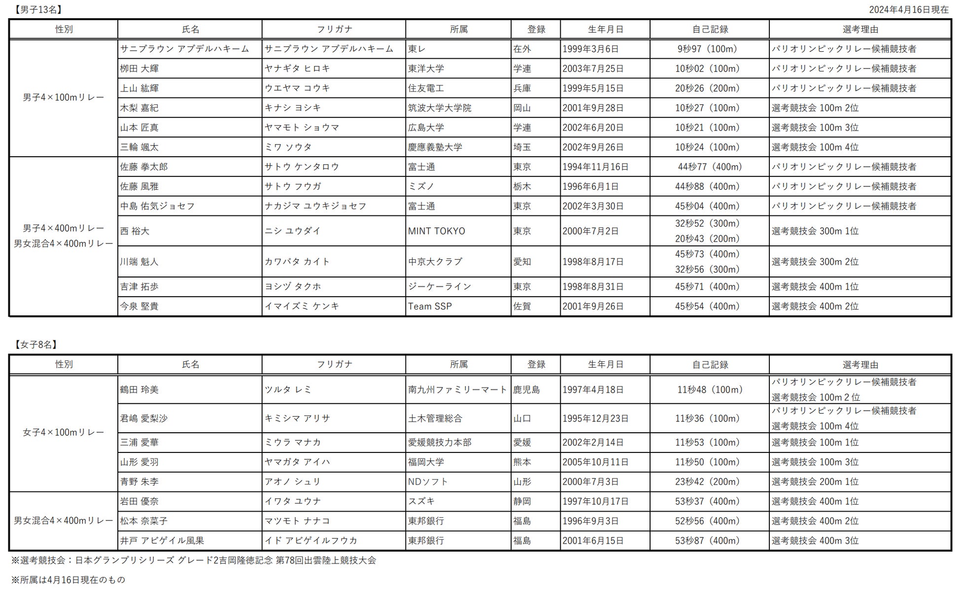 男子4×100mリレーにはブダペスト2023世界選手権男子100m6位入賞で2大会連続ファイナリストとなったサニブラウンアブデルハキーム(東レ)、バンコク2023アジア選手権男子100m金メダリストの栁田大輝(東洋大学)、杭州2022アジア競技大会200m金メダリストの上山紘輝(住友電工)等が日本代表に決定、男子4×400mリレーには男子400mで昨年32年ぶりに日本記録を更新した佐藤拳太郎(富士通)、男子400mで日本歴代3位の記録をもつ佐藤風雅(ミズノ)等が日本代表に決定いたしました。