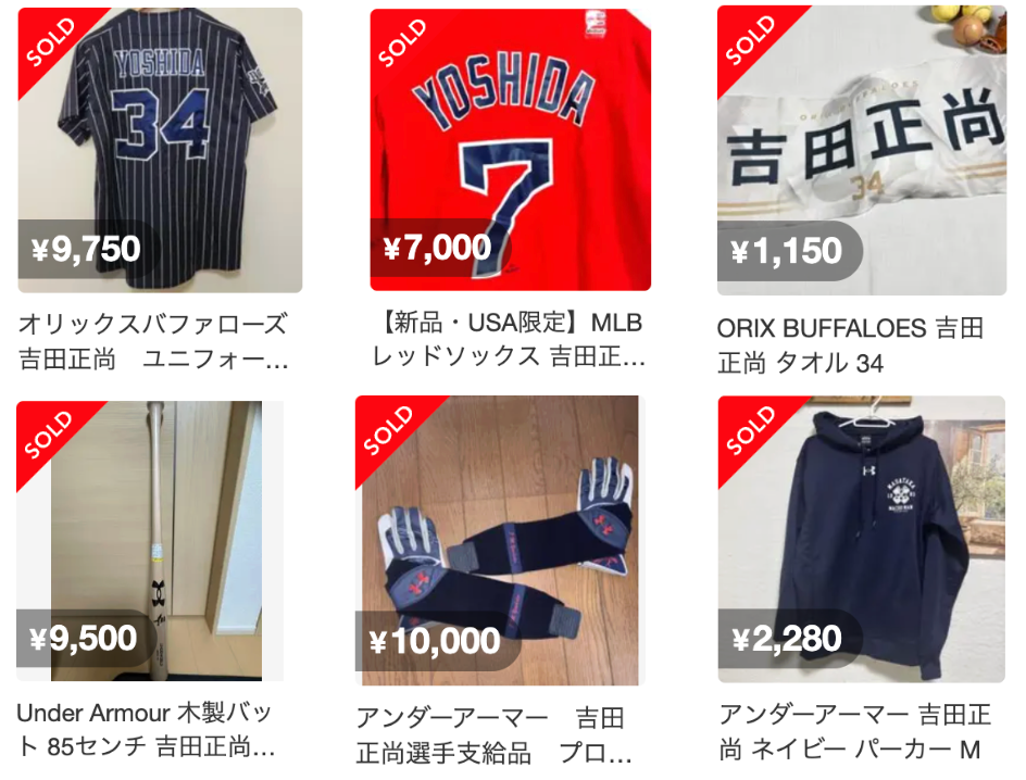 また、2月22日から3月10日までの期間に、「吉田 正尚」というワードを含む商品のうち、昨年同期比で「メルカリ」内の取引件数が増えた商品カテゴリーを調べたところ、1位「応援グッズ」、2位「記念グッズ」、3位「スポーツカード」という結果になっており、「吉田 正尚」選手の活躍でファンの応援したい気持ちが加速したことが分かります。