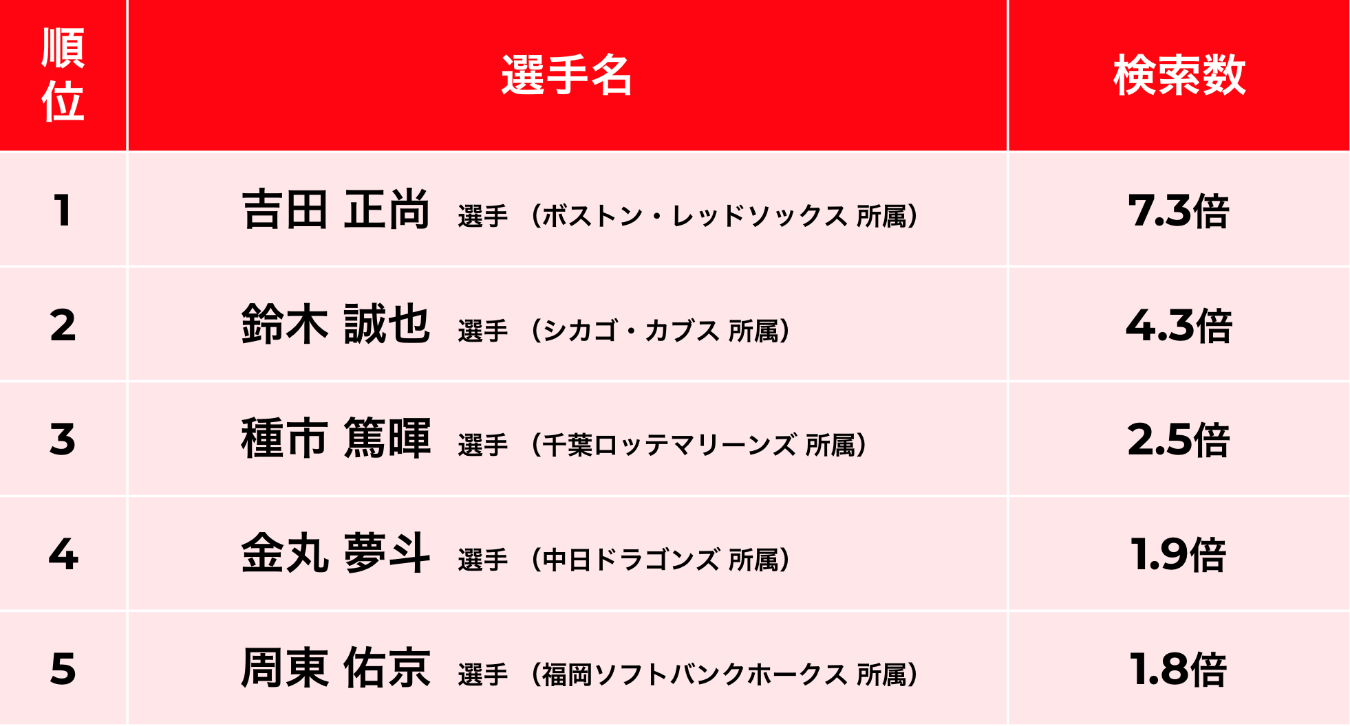 また、急上昇ランキングのトップ5にはランクインしていませんが「大谷 翔平」選手は、野球日本代表選手の中で、壮行試合から1次ラウンドまでの期間中の検索数で圧倒的な1位を記録しており、不動の人気と圧倒的な注目度の高さを改めて証明しています。