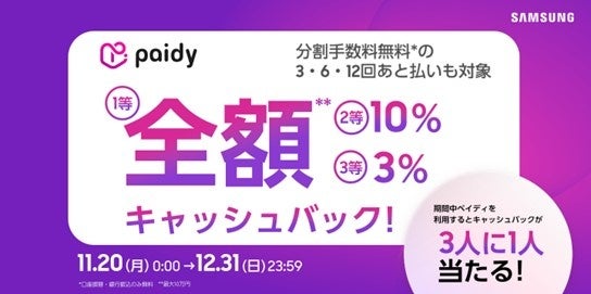サムスン電子ジャパン株式会社は、本日2023年11月20日(月)より、あと払い(BNPL)サービス「ペイディ」で開始する「3人に1人当たる!キャッシュバックキャンペーン」に参加いたします。Samsungオンラインショップ( https://www.samsung.com/jp/offer/ )にて「ペイディ」で決済いただくと、ご利用後に抽選で3人に1人がキャッシュバック対象になるキャンペーンです。ぜひこの機会にGalaxy製品をご検討ください。