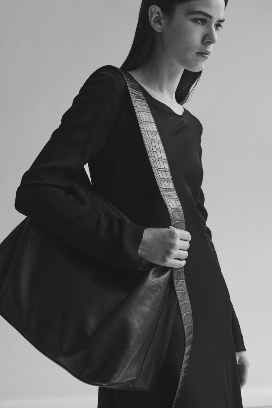 帯のようなクロコダイルの型押しレザーストラップが存在感のあるショルダーバッグ。金具などの凹凸が入らず1枚フラットに使用された幅広のストラップがデザイン性を高め、柔らかなイタリアンレザーでつくられたボディとの構成が、華やかで上品な佇まいのバランスを生み出しています。1型のピエスユニックをご紹介。