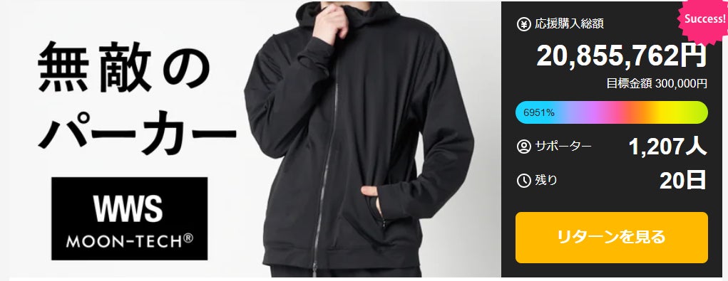 WWS×MOONRAKERS、汗ジミ防止・消臭などの機能性搭載「無敵のパーカー・パンツ」を共同開発!わずか10日で1000名を超える応援を頂き、Makuake応援総額2,000万円を突破!