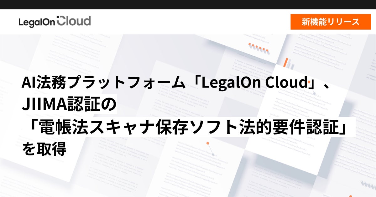 株式会社LegalOn Technologies(本社:東京都渋谷区 代表取締役 執行役員・CEO:角田 望)が提供する、法務業務全体を包括的に支援するAI法務プラットフォーム「LegalOn Cloud」(https://www.legalon-cloud.com/ )の「コントラクトマネジメント」において、公益社団法人日本文書情報マネジメント協会(以下、JIIMA)より、「電帳法スキャナ保存ソフト法的要件認証」を取得しました。