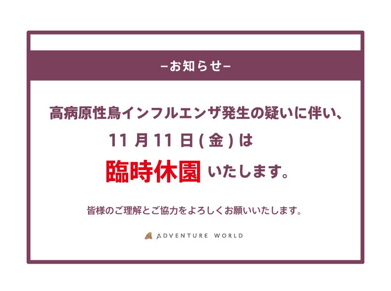 アドベンチャーワールド 高病原性鳥インフルエンザ発生の疑いに伴う臨時休園について