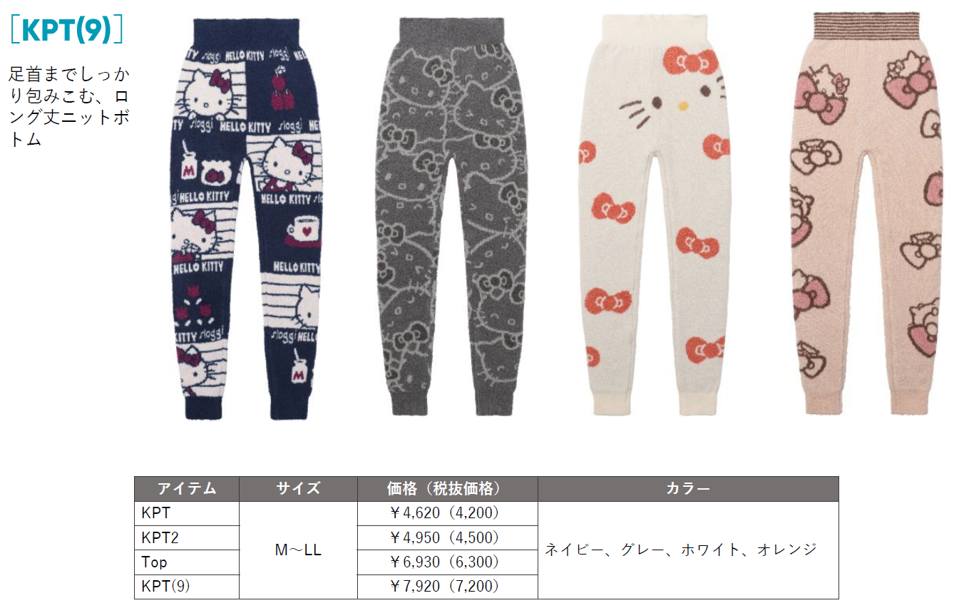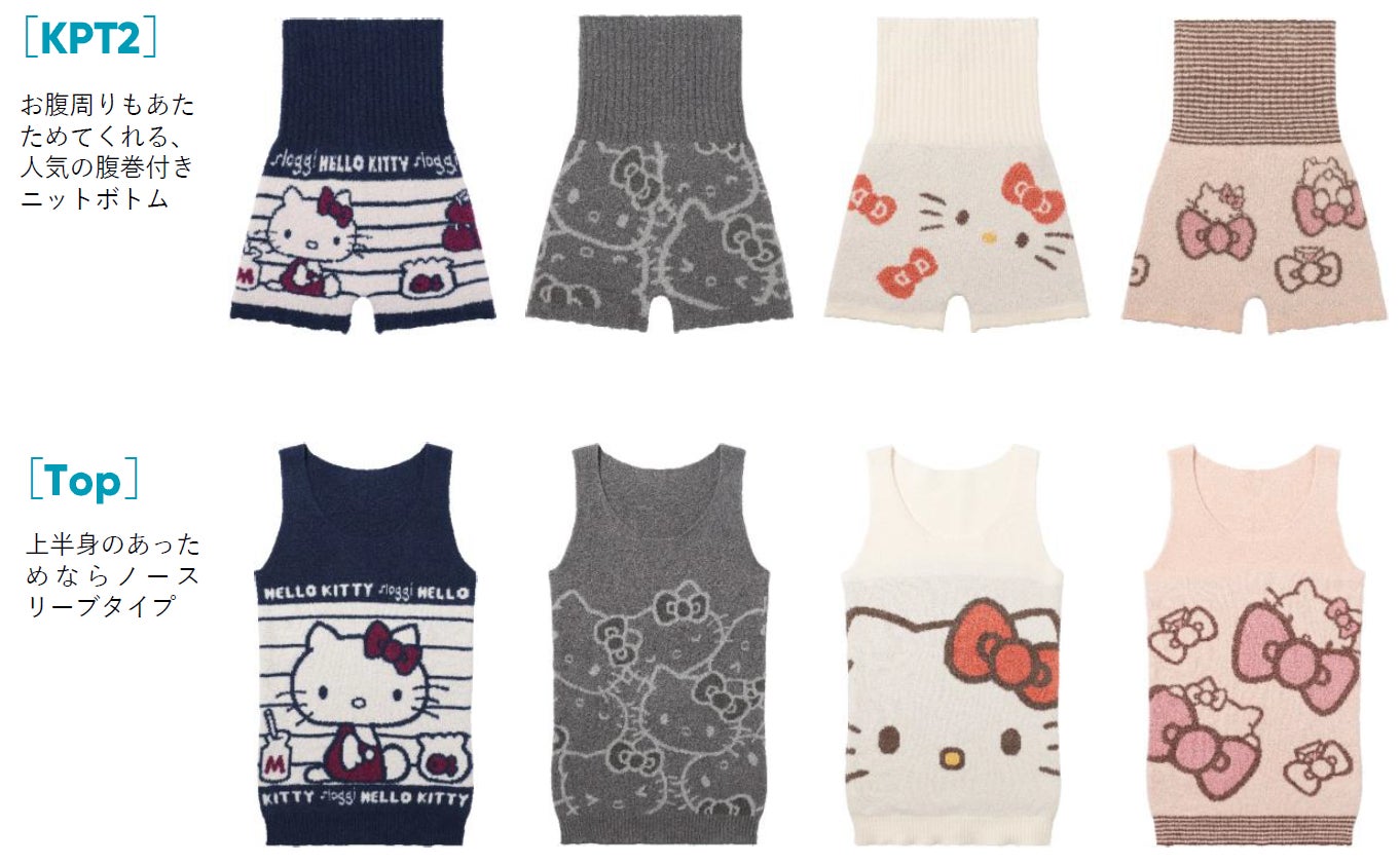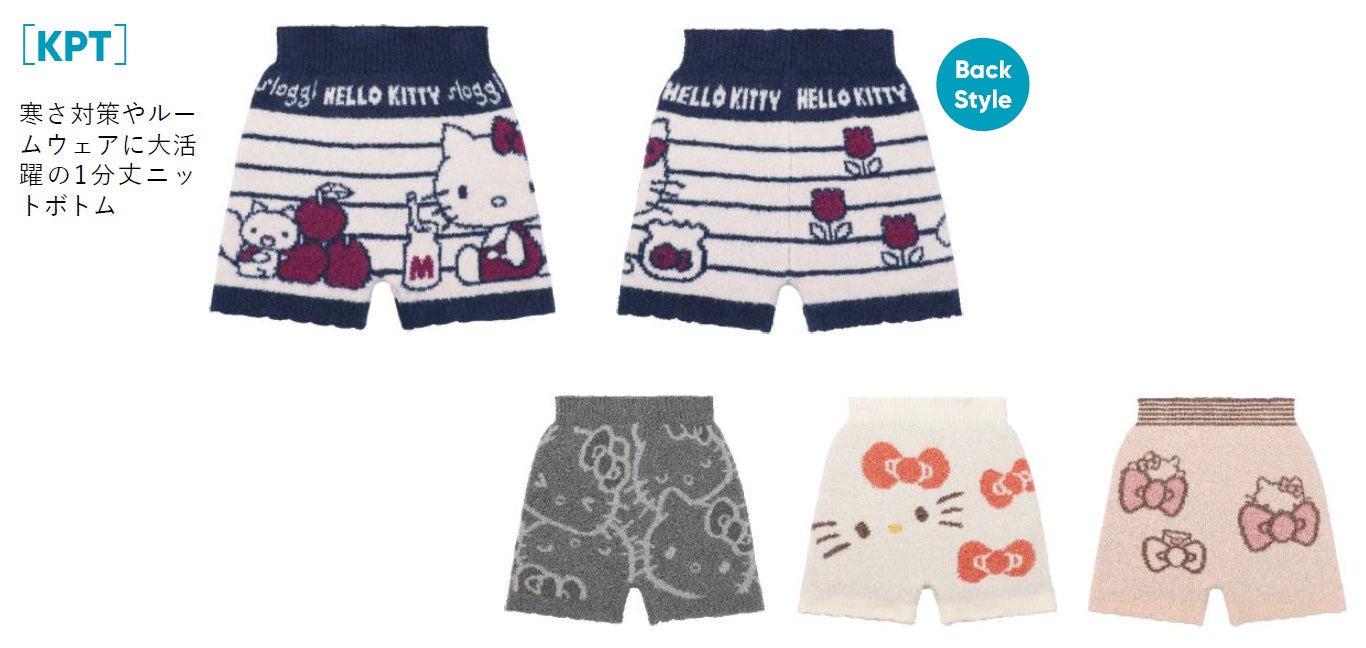 ふわふわで柔らかい糸を使用したニットインナーシリーズが、今年誕生50周年を迎えたハローキティ柄で登場します。アイテムは、スカートの下に履いてあたたかくすごせるショートパンツタイプのボトムと、腹巻付きボトム。お部屋で過ごす時間が楽しくなるロングボトム、ノースリーブトップスの4型。柄も、4タイプからお選びいただけます。