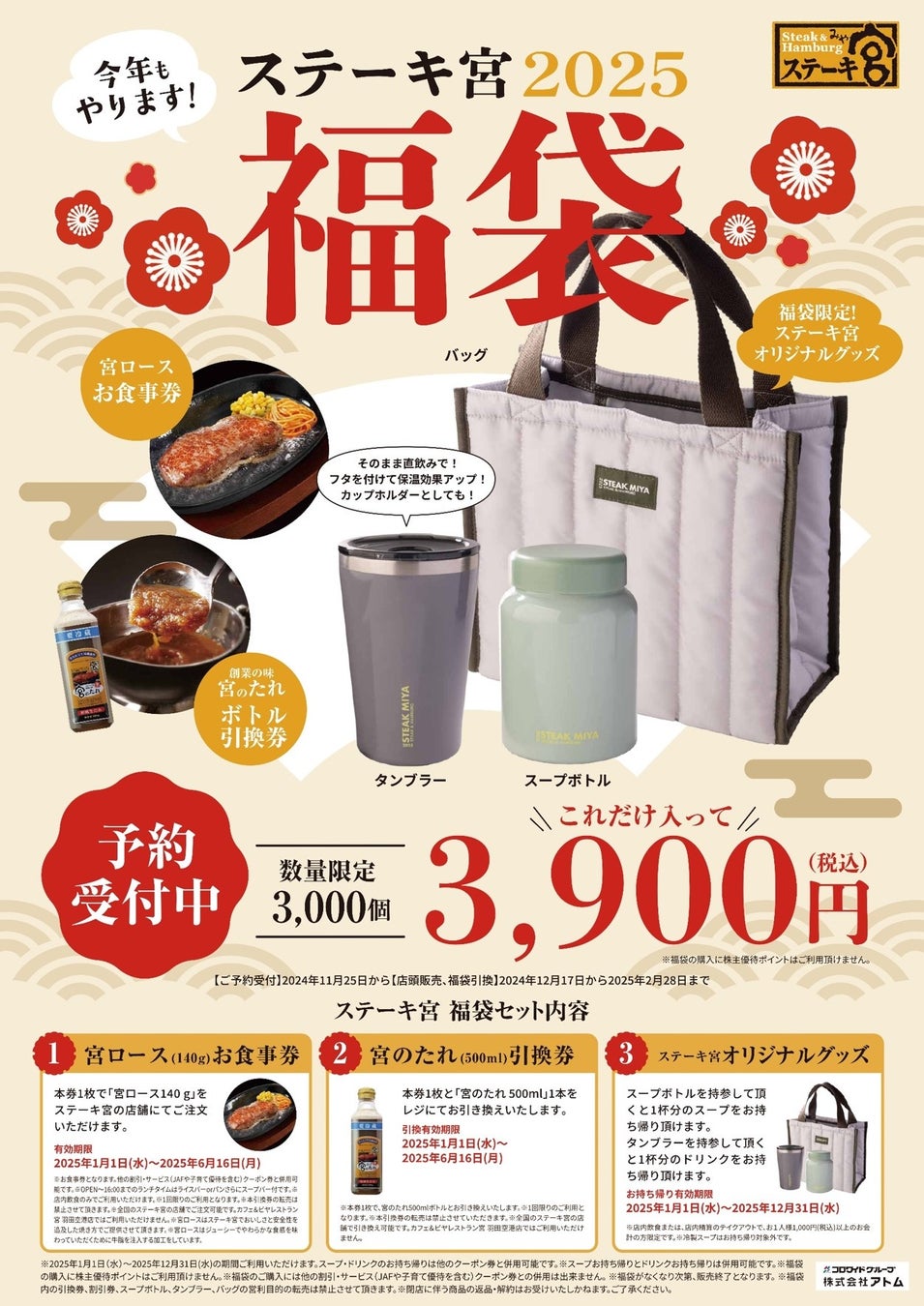 コロワイドグループの株式会社アトム(本社:神奈川県横浜市、代表取締役社長:田中公博)は、ステーキ宮全店112店舗で、2024年11月25日(月)よりステーキ宮2025福袋を予約販売開始いたします。