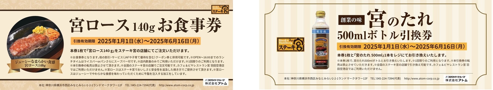 ※全国のステーキ宮の店舗で引き換え可能です。カフェ&ビヤレストラン宮 羽田空港店ではご利用いただけません。