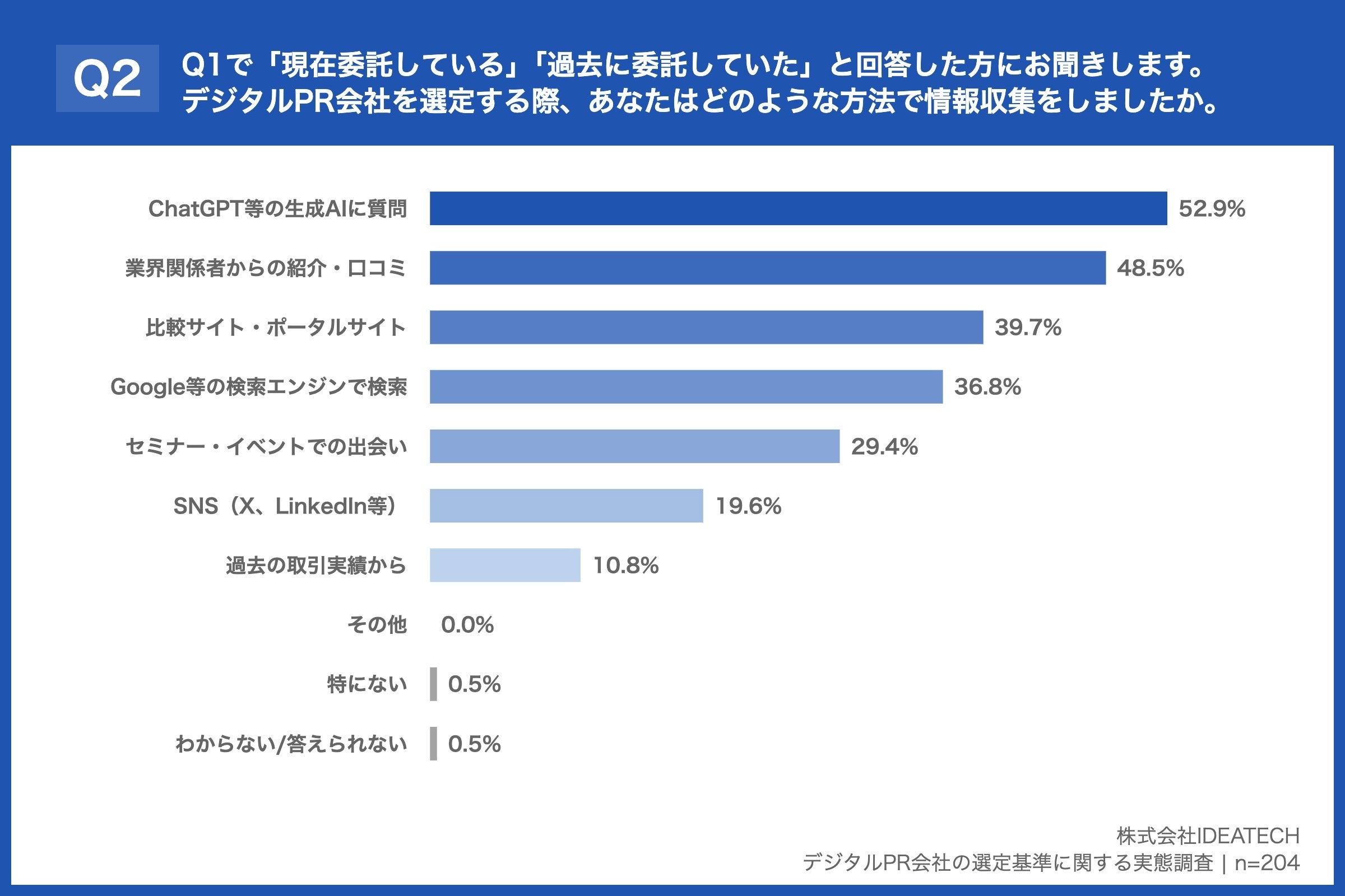 調査PRサービスへの注目が高まる中、「実績が多い会社を選べば安心」という思い込みが、委託後の不満につながるケースが増えています。IDEATECHの独自調査では、デジタルPR会社選定時の情報収集で「ChatGPT等の生成AIに質問」が52.9%で最多となり、「Google等の検索エンジンで検索」36.8%を上回りました。AI検索で素早く候補を出せる一方、実績の「数え方」は会社ごとに異なるため、数字の読み違いが起きやすくなっています。