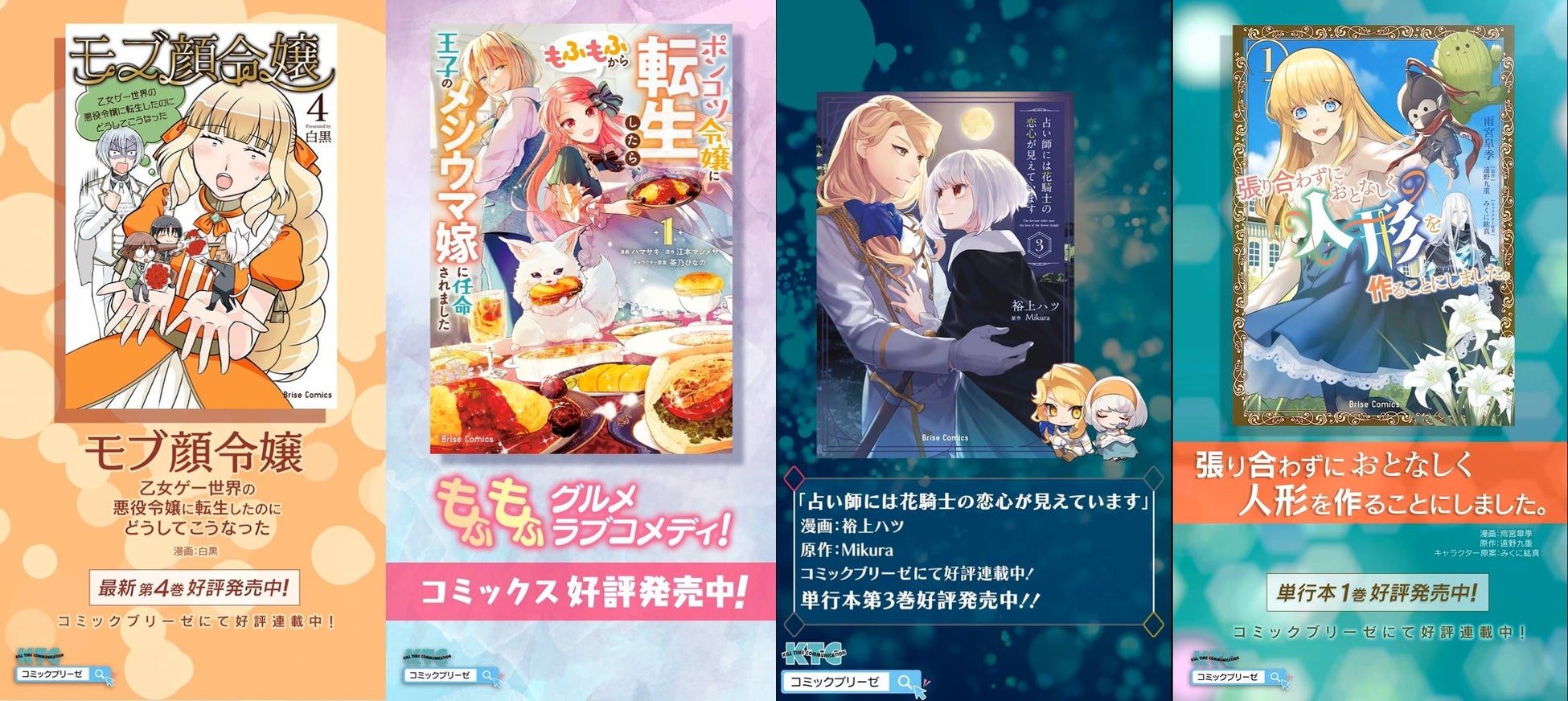 『モブ顔令嬢~乙女ゲー世界の悪役令嬢に転生したのにどうしてこうなった~』『ポンコツ令嬢に転生したら、もふもふから王子のメシウマ嫁に任命されました』『占い師には花騎士の恋心が見えています』『張り合わずにおとなしく人形を作ることにしました。』のコミックブリーゼ4作品が京急川崎駅に登場!