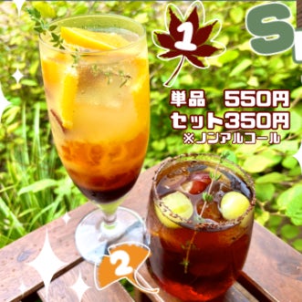 サングリアを子供から大人まで飲んでいただけるようソーダにしました。ミモザのジュレ、濃厚なぶどうシロップ、ぶどうとオレンジがごろごろと入って程よい甘さとさっぱりさが秋を感じさせます。