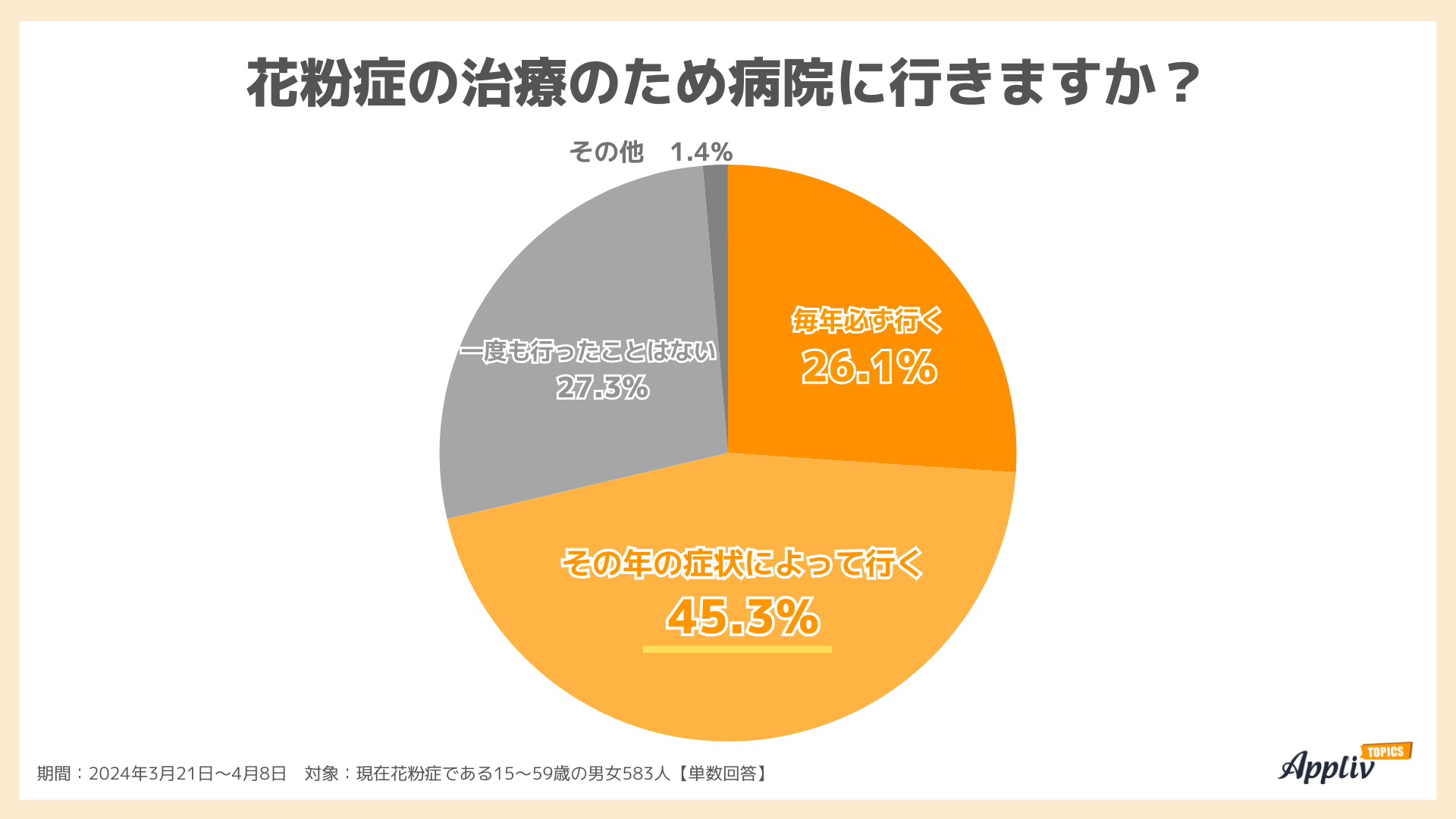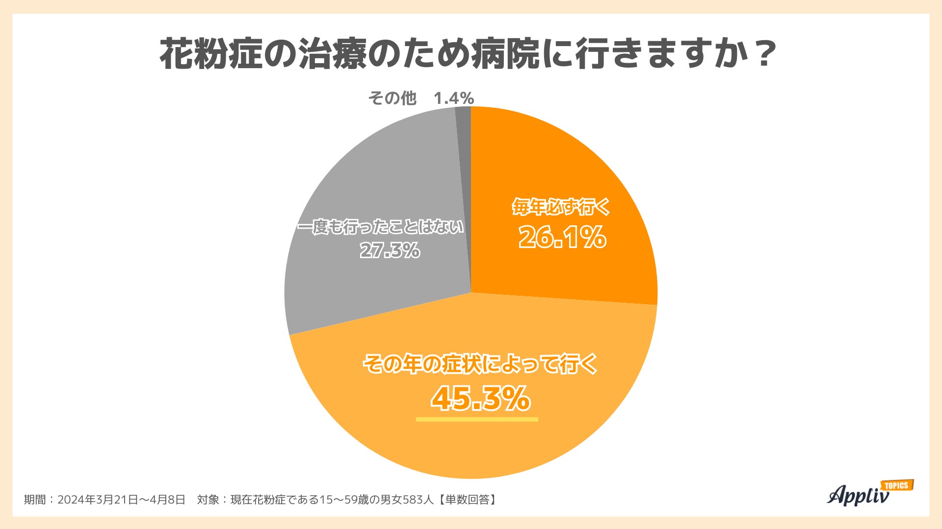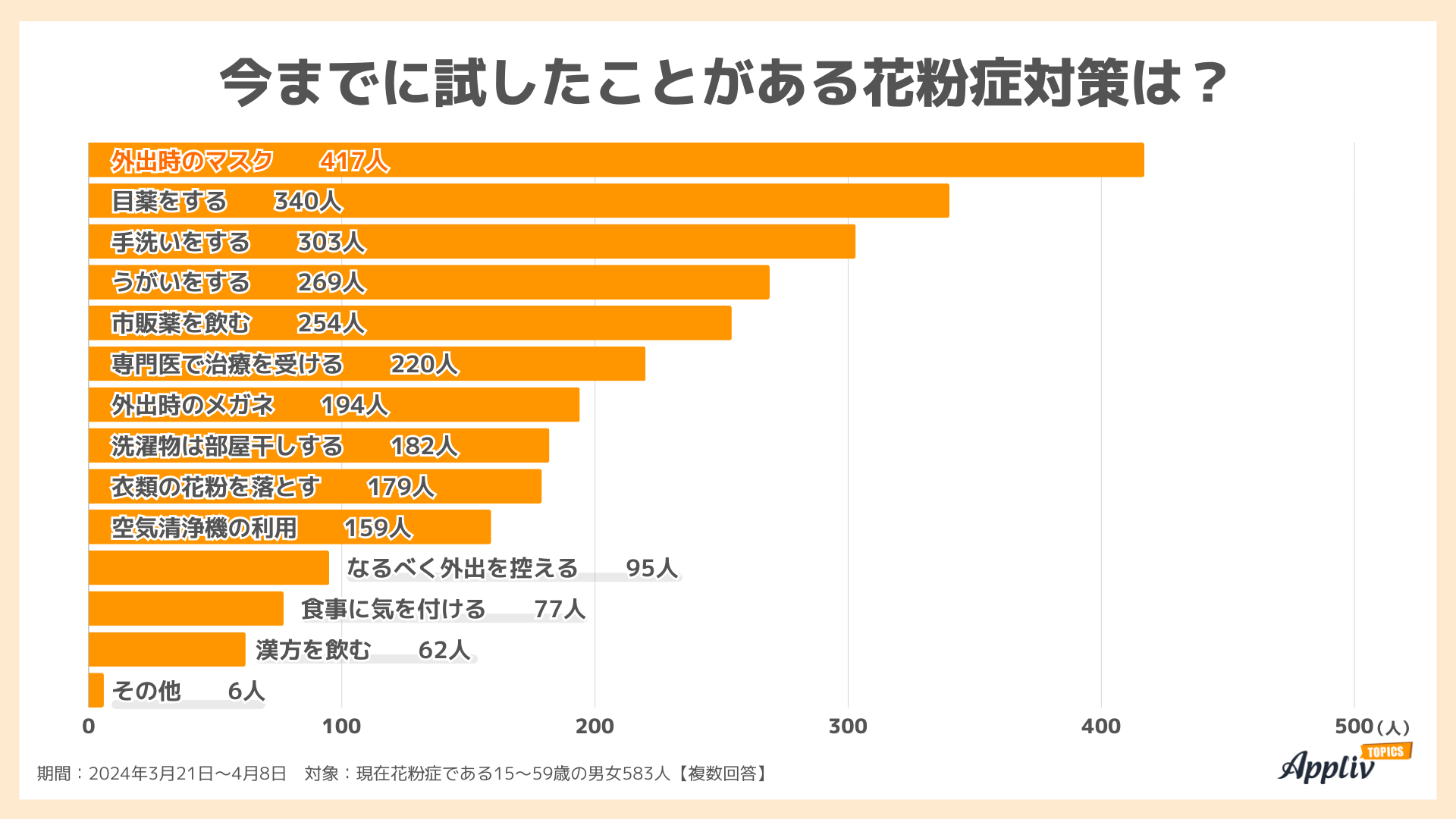 「Appliv TOPICS」は花粉症であると回答した15~59歳の男女583人を対象に、2024年3月27日~4月8日の期間で、花粉症に関するアンケートを実施しました。